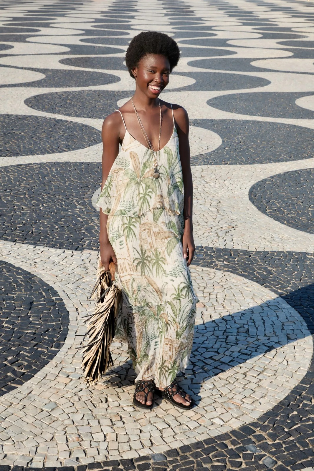 vestido pontas teresa. com alças finas, traz um charme único e leveza para os dias ensolarados. a modelagem ampla com camadas fluidas garante movimento elegante. perfeito para ocasiões casuais que pedem conforto e estilo. FARM Rio, coleção Carioca - inverno 26.