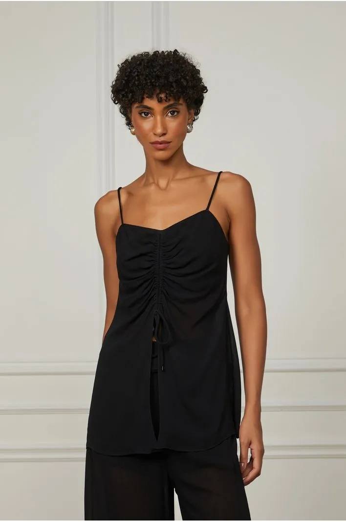 A túnica com alcinha franzida na cor preta é feita de georgette, com composição 100% viscose. Possui comprimento alongado, alças finas e decote em V na frente e reto nas costas, com fechamento delicado com botões. Destaque para o franzido no centro da peça, que pode ser ajustado conforme desejado. Transita bem em vários tipos de ocasiões.