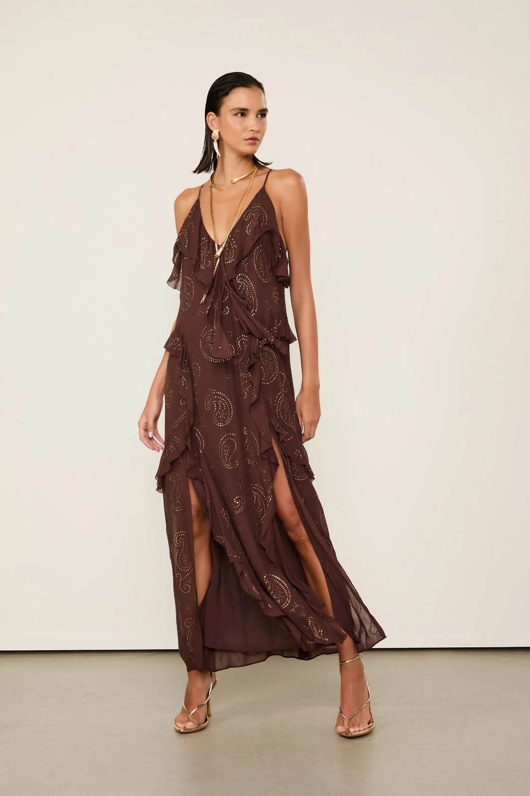 Vestido Midi Liso com decote em V, alças e shape evasê com fenda na barra. Como detalhe especial, possui babados e hotfix aplicados em padrão de paisley. Uma escolha sofisticada para a temporada.