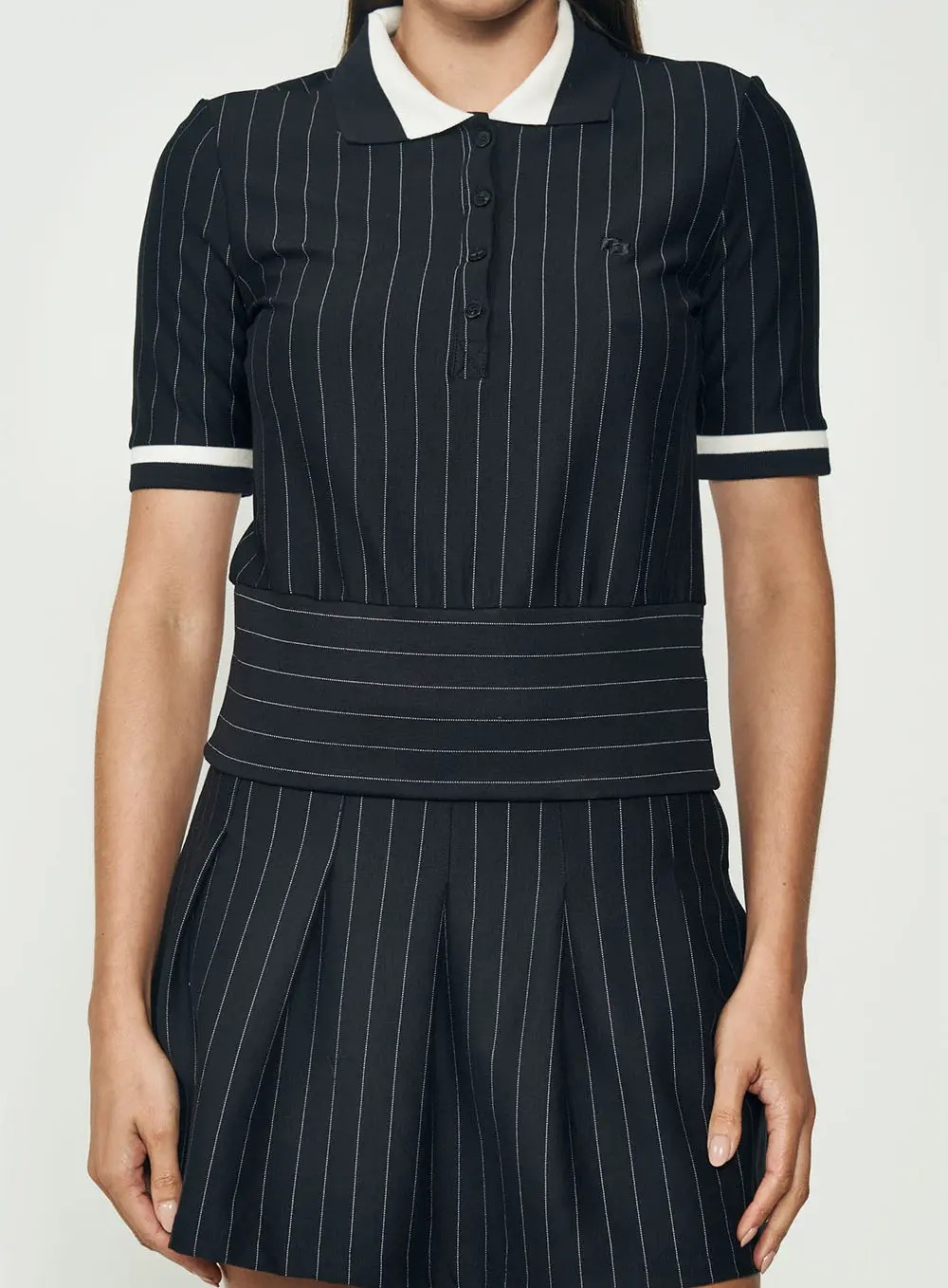 Blusa: Modelagem ajustada, mangas curtas com detalhe em ribana contrastante, gola polo, tecido listrado, faixa na cintura.