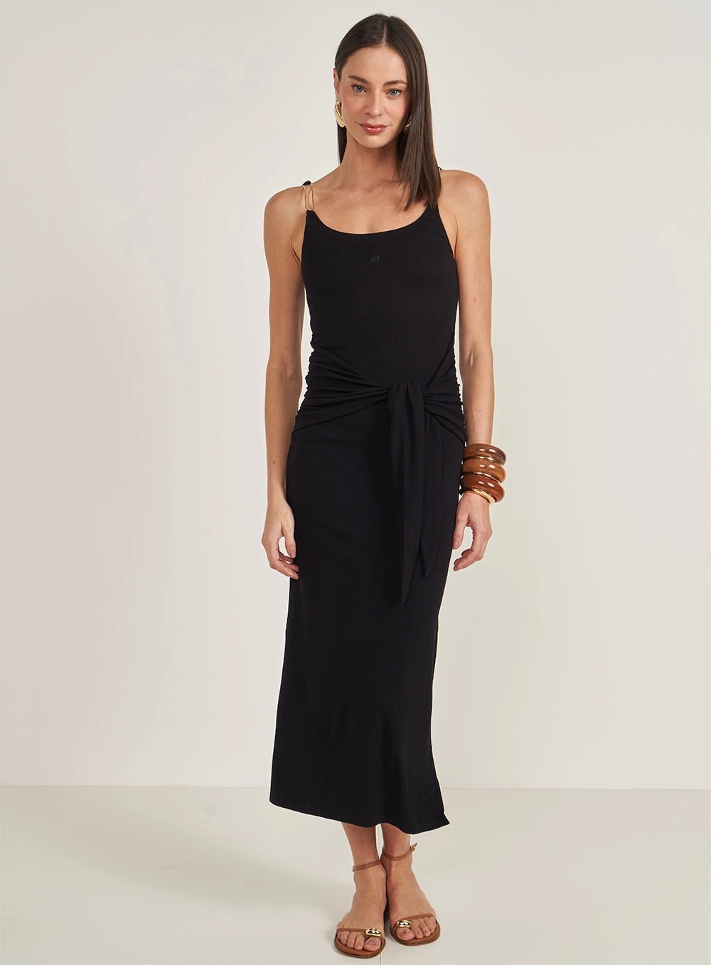 Vestido: Modelagem slim fit, comprimento midi, alças finas com detalhe em metal e faixa para amarração na cintura, com textura canelada. Tecido: Confeccionado em 96% Viscose e 4% Elastano, garantindo um caimento fluido, toque macio e elasticidade para o máximo conforto. Detalhes: As alças possuem um refinado acabamento em metal, e a faixa na cintura permite um ajuste personalizado, realçando a silhueta. Funcionalidade: Uma peça extremamente versátil, que combina elegância e bem-estar, ideal para transitar do dia para a noite.