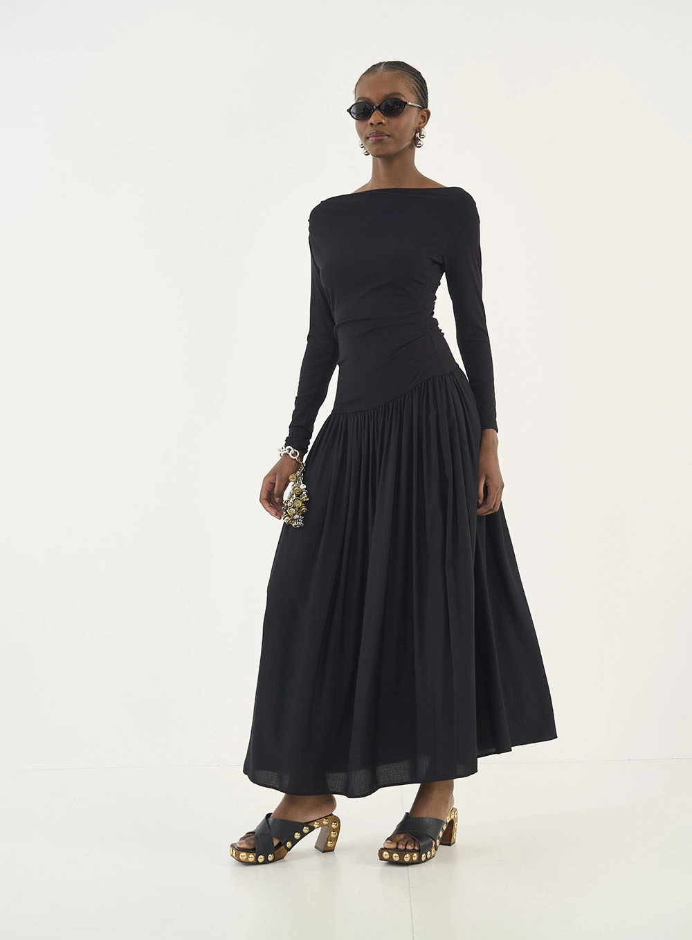 Funcionalidade: A elasticidade do busto combinada à fluidez da saia oferece o máximo de bem-estar e liberdade de movimento, sem perder a postura impecável exigida pela Milan Fashion Week.