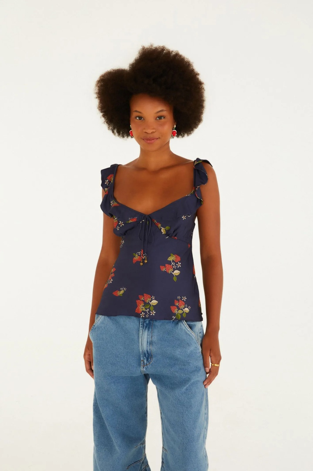 blusa alcinhas estampada doce morango. com alcinhas delicadas e ajustáveis, traz um decote em v com amarração frontal que adiciona charme e personalidade. confeccionada em tecido leve, é perfeita para um visual casual que transita do dia à noite. combine com calças fluidas ou shorts descontraídos para encontros descontraídos e jantares ao ar livre.