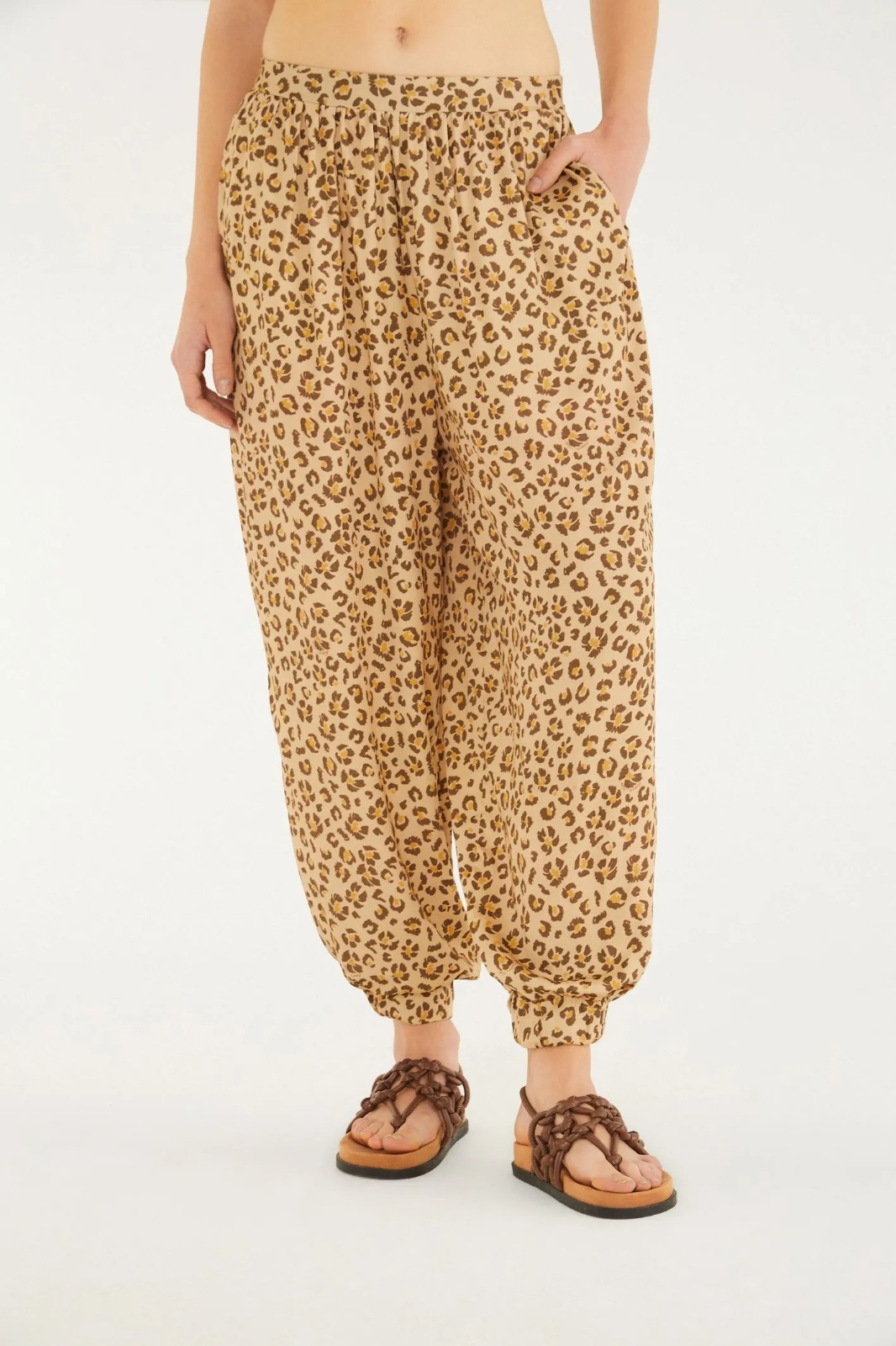 calça aladim onça floral. com cintura ajustável e corte fluido, o modelo proporciona conforto e estilo único. os punhos elásticos adicionam um charme especial e destacam o design casual. ideal para momentos de lazer ou eventos ao ar livre. experimente com blusas leves e incrementa seu guarda-roupa de forma exclusiva.