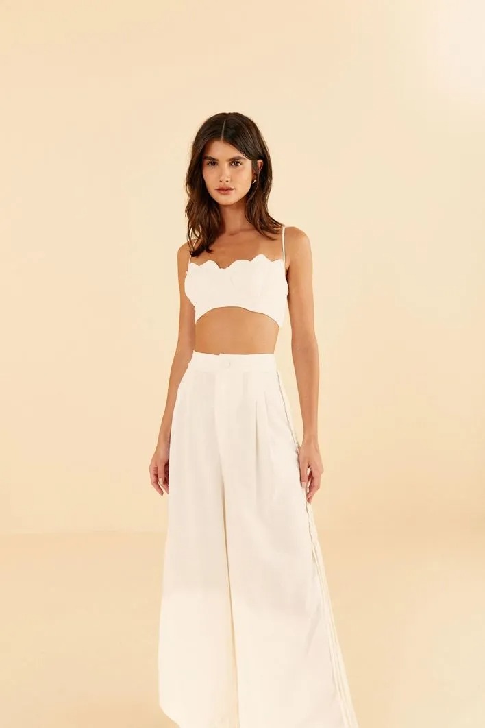 calça trançada lateral. possui cós reto na parte da frente e com elástico largo nas costas. abertura frontal com um botão bomber caseado e zíper. tem pregas abertas bem abaixo do cós e bolso faca nas laterais do quadril. possui detalhe de trança vertical nas laterais. o modelo é todo em linho, possui modelagem de pernas retas e fendas nas laterais próximo a barra. essa é uma peça da coleção de Alto Verão: FARM RIO do Brasil.