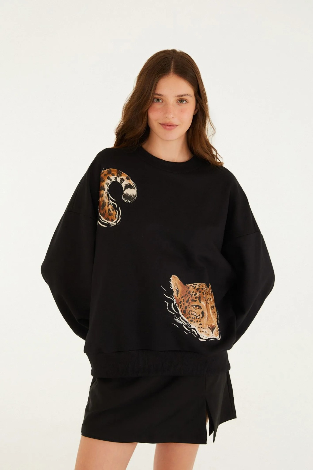 casaco moletom onça. com arte exclusiva e vibrante, o moletom traz a textura macia e o corte solto que garantem conforto e estilo. as mangas longas e o acabamento no punho criam um visual casual perfeito para dias frescos. ideal para combinações despojadas, ele transforma qualquer look.