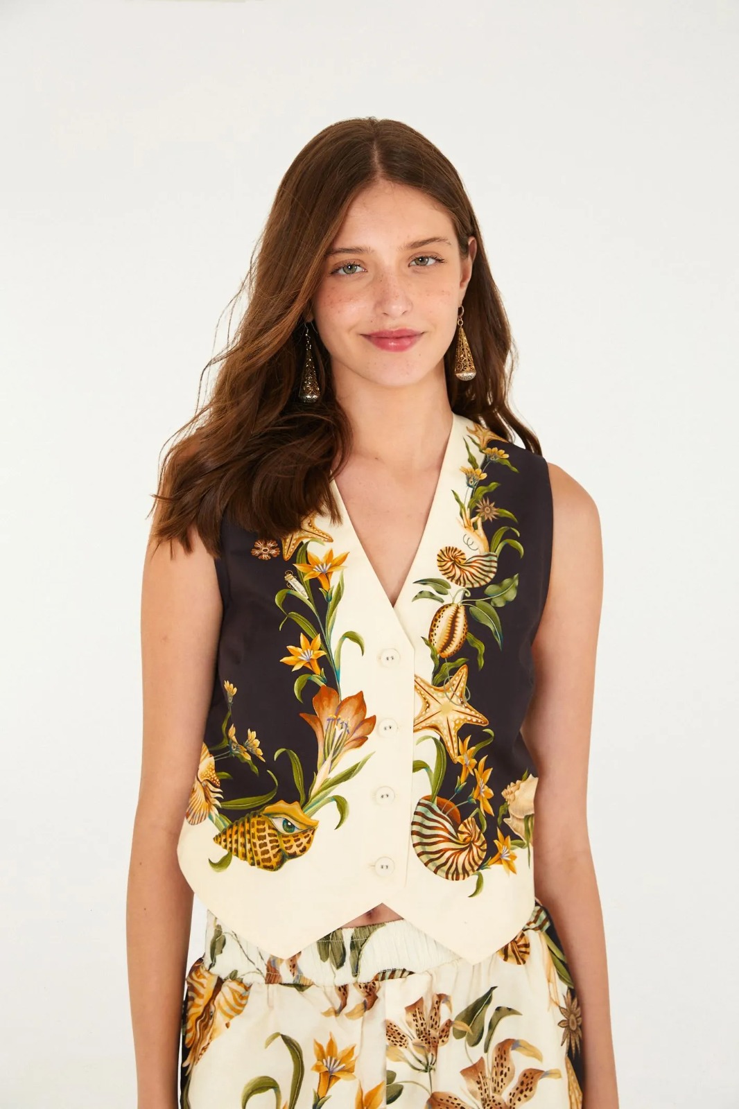 colete concha surreal. traz gola em v com fechamento frontal em botões, ideal para sobreposições cheias de estilo. possui detalhe cativante que eleva qualquer look. perfeito para um encontro casual ou um passeio descontraído, combinando tanto com jeans quanto com saias leves.