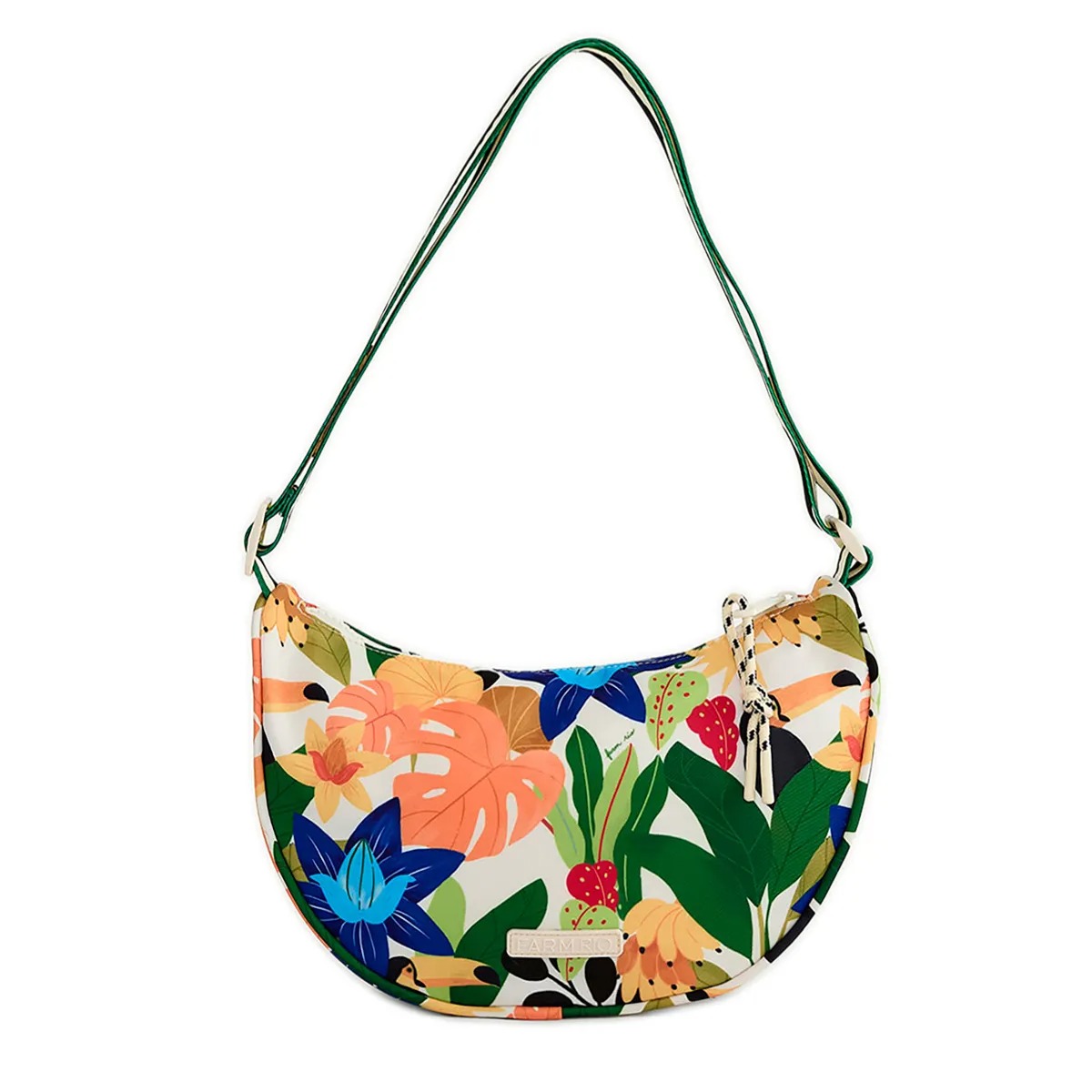 Bolsa casual com abertura principal e bolso na parte de trás com fechos de zíper. alça com regulagem para uso transversal ou como tote bag.