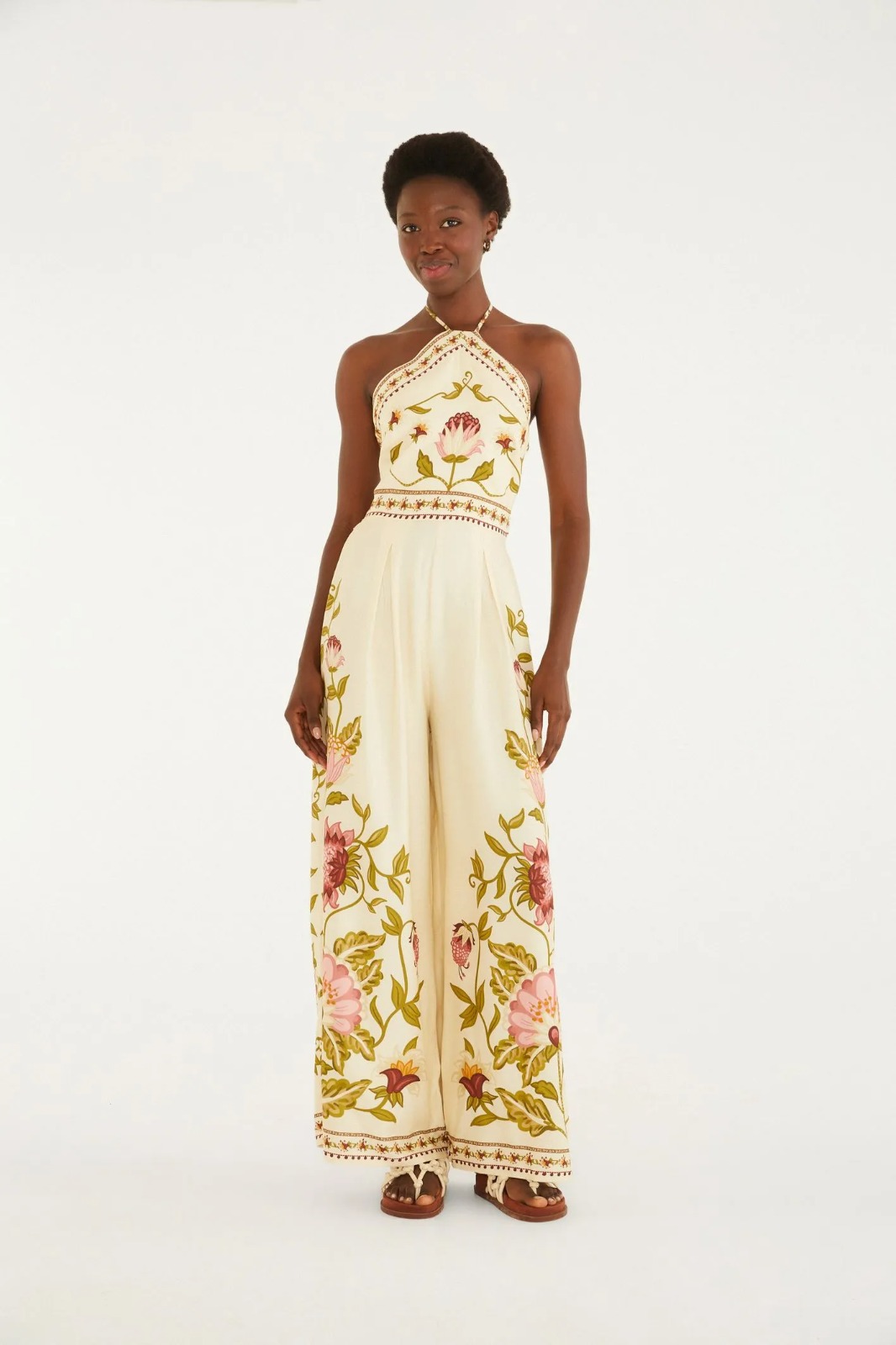 macacão natureza romântica. alças finas com amarração no pescoço e costas abertas conferem um toque especial e delicado. a modelagem ampla e fluida junto à cintura marcada proporciona charme. ideal para eventos diurnos ou um passeio casual, é a escolha perfeita para expressar estilo e originalidade.100% Viscose Forro 100% Viscose