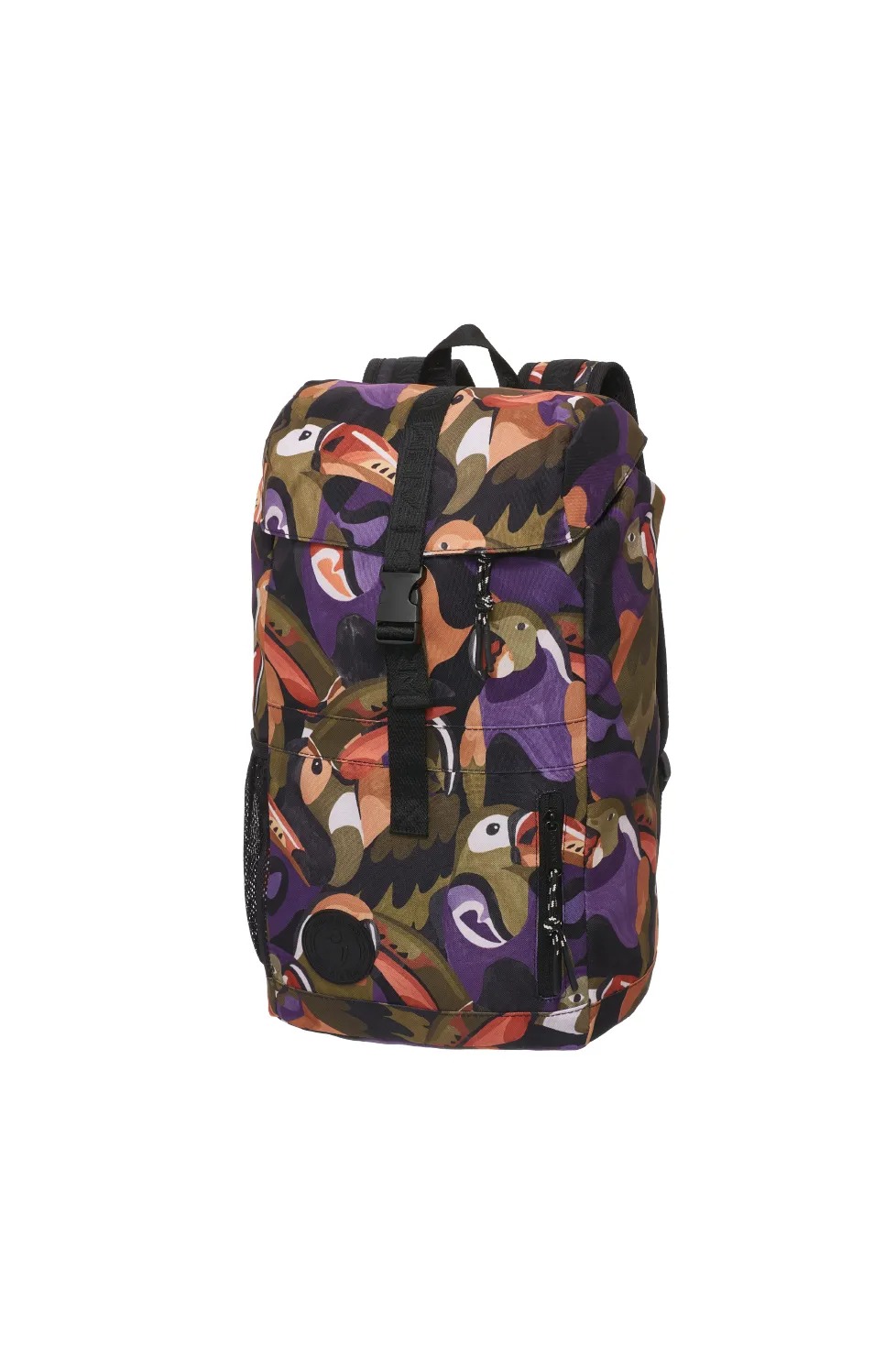 Mochila costas estampada com tampa confeccionada em poliéster, logo emborrachado no painel frontal, bolsos laterais, alças estampadas ajustáveis, puxadores de zíper personalizados em metal colorido com logo em baixo relevo e corda com ponta emborrachada e etiqueta emborrachada costurada.