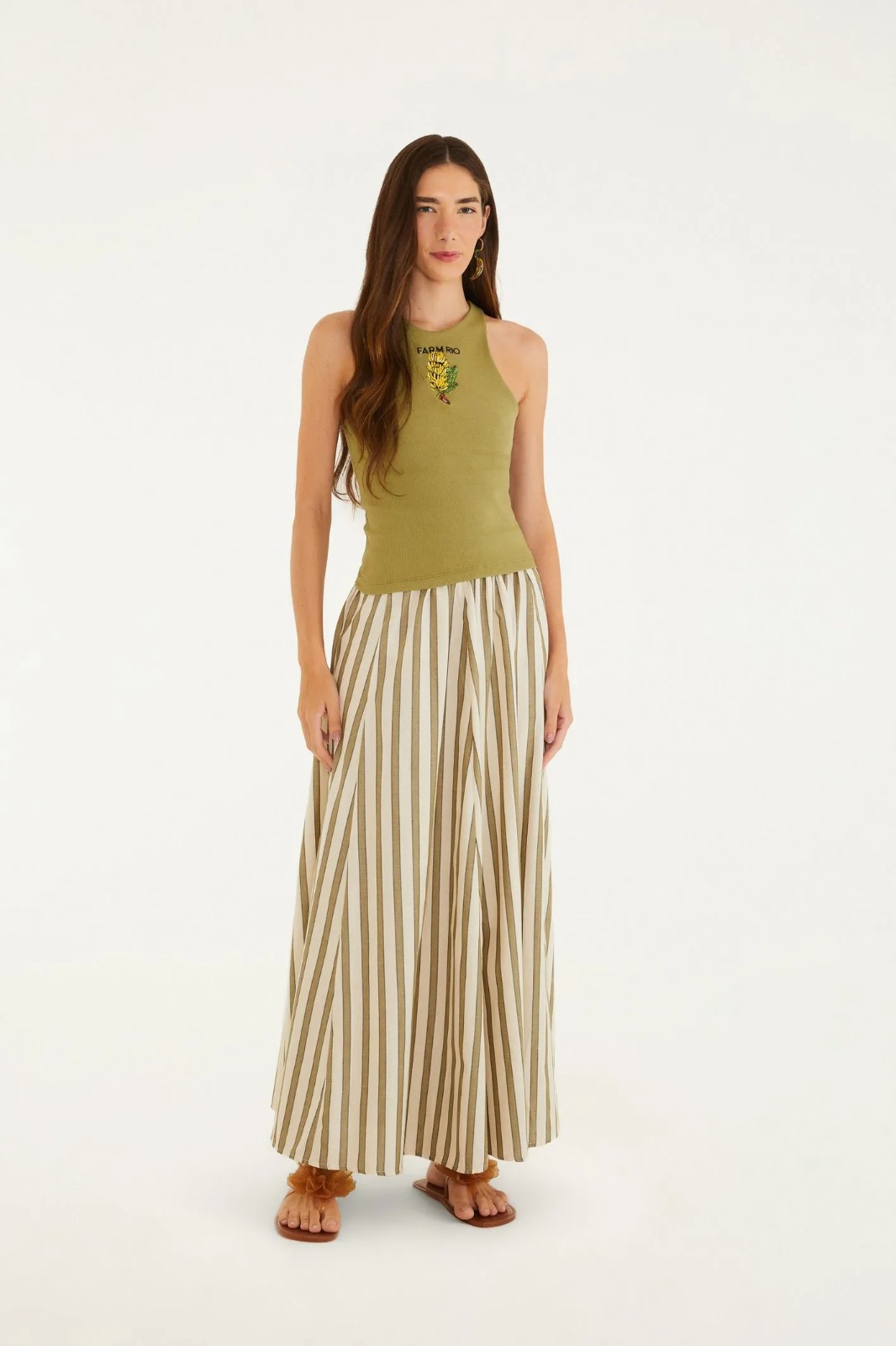 saia listra morerê. confeccionada em tecido leve, essa saia longa possui corte fluido que proporciona movimento a cada passo. cintura ajustada com elástico oferece conforto e praticidade. perfeita para dias casuais ou eventos ao ar livre, ela traz um toque de frescor e estilo ao seu guarda-roupa. FARM RIO original - verão 26.