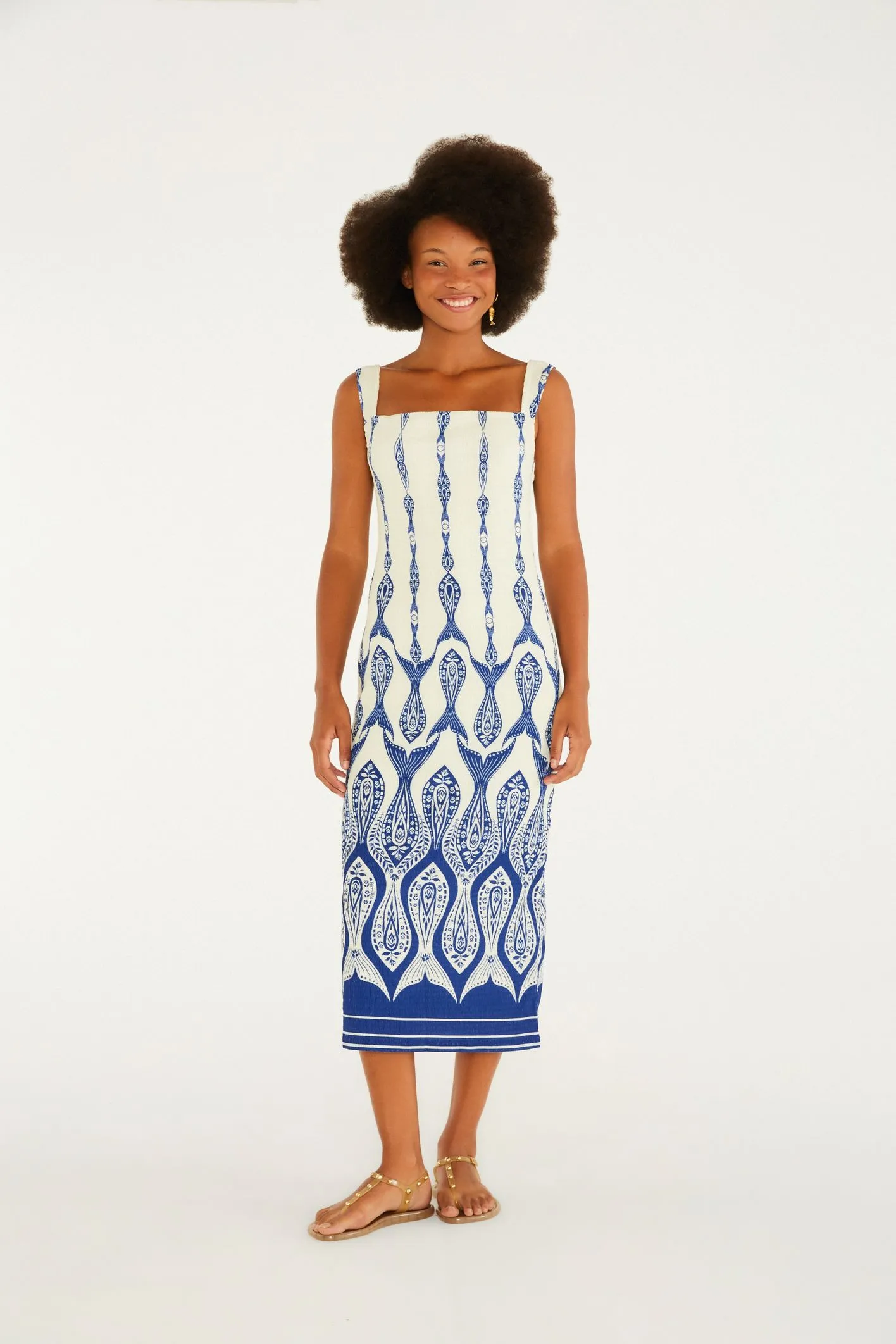 vestido alça estampado mar de estrelas. modelo midi com decote quadrado e alças largas que garantem conforto. costas com decote em v que traz um toque casual. confeccionado em tecido leve, combina com passeios ao ar livre ou encontros descontraídos. estampa exclusiva que eleva qualquer produção. FARM RIO original - alto verão 26.