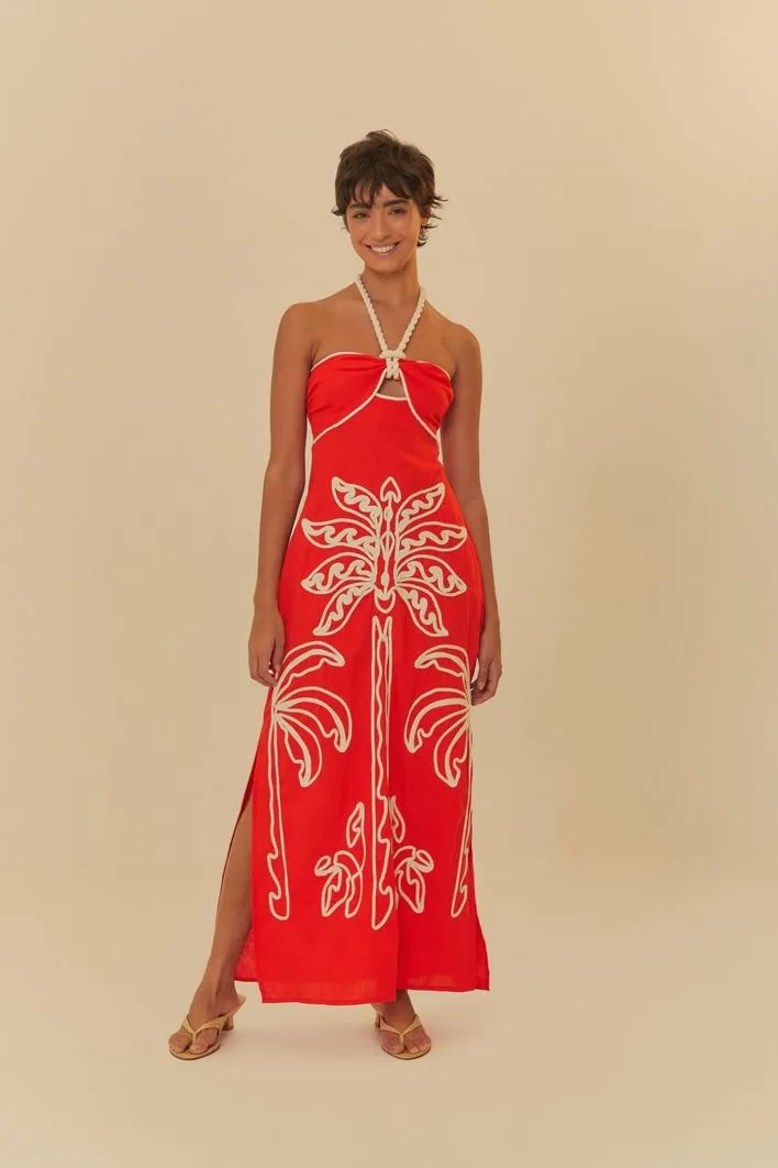 vestido bordado coqueiro majestoso. possui decote reto sem alças e com ombros à mostra, proporcionando um visual autêntico e moderno. o comprimento é longo, com uma modelagem leve e side slit que garante movimento a cada passo. ideal para eventos casuais ou um passeio à beira-mar. esta é uma peça exclusiva da coleção FARM RIO original - alto verão 25.