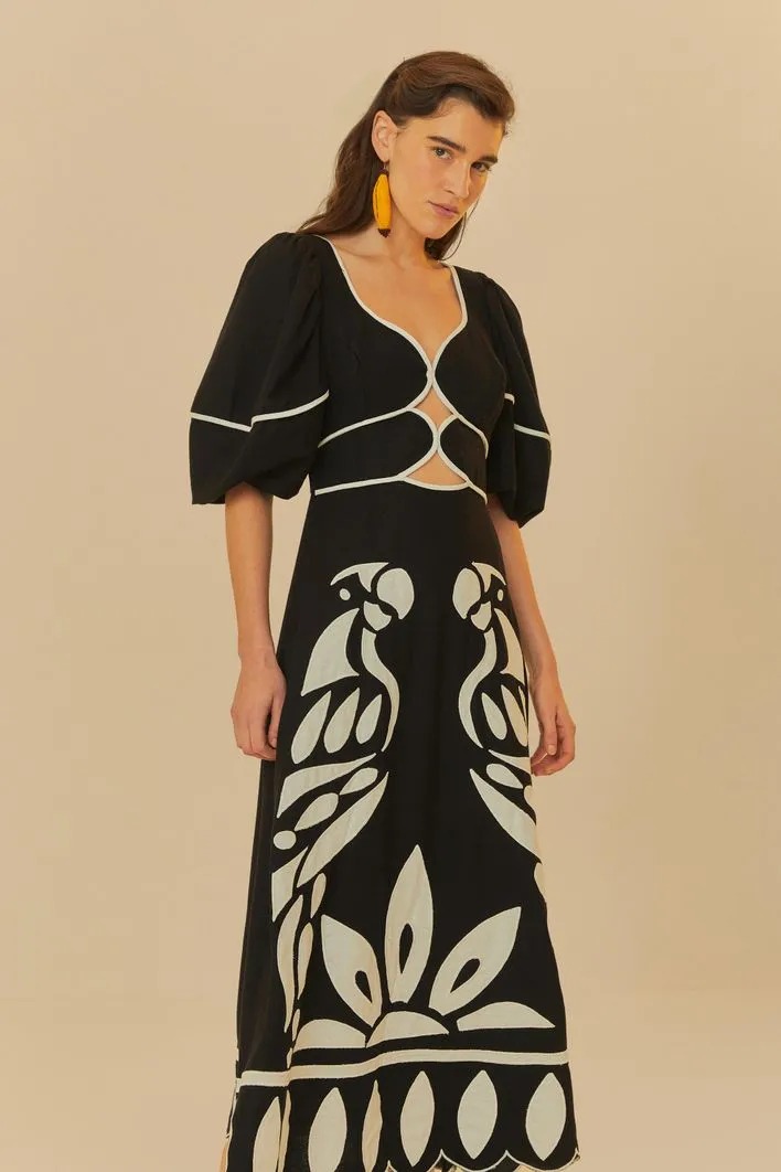 vestido bordado cutwork samambaia preto. com decote em v orgânico e delicados recortes, o vestido possui mangas bufantes com acabamento em viés. traz bordado localizado e barrado único na técnica cutwork, toque artesanal que é só bater o olho pra saber que é FARM. em tecido leve, é a peça-chave para ocasiões especiais ao ar livre. Produto exclusivo da coleção FARM RIO original - verão 25.