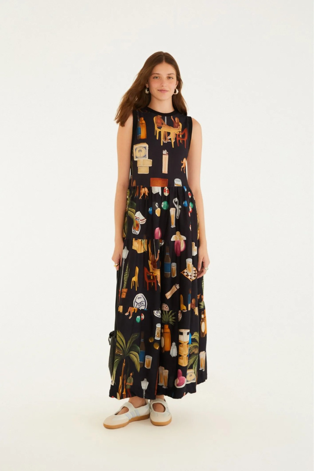 vestido cropped estampado boteco carioca. modelo sem mangas e gola alta, trazendo um toque moderno e casual. confeccionado com tecido leve e caimento fluido, perfeito para um passeio à tarde ou um jantar descontraído. o design exclusivo cria um visual único e charmoso.