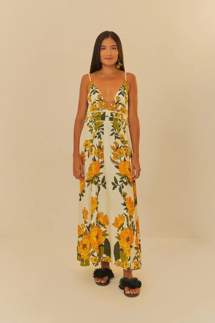 vestido cropped estampado jardim tranquilo. confeccionado em tecido leve, possui um decote em v profundo, alças finas ajustáveis e franzido sob o busto, proporcionando conforto e estilo. o comprimento midi agrega toque moderno à peça, tornando-a ideal para dias ensolarados e ocasiões descontraídas. esta é uma peça exclusiva da coleção FARM RIO original - verão 25.