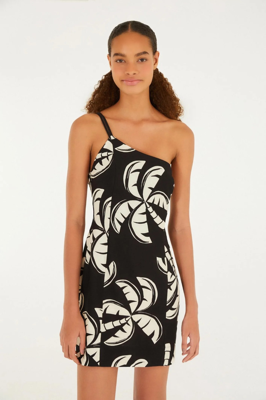vestido curto estampado coqueirada. a modelagem é moderna, com um corte assimétrico de alça única, destacando um ombro à mostra. confeccionado em tecido leve e confortável, é perfeito para um look casual e cheio de estilo. ideal para um passeio à tarde ou um evento descontraído. uma peça que traz personalidade ao guarda-roupa. FARM RIO original - alto inverno 25.