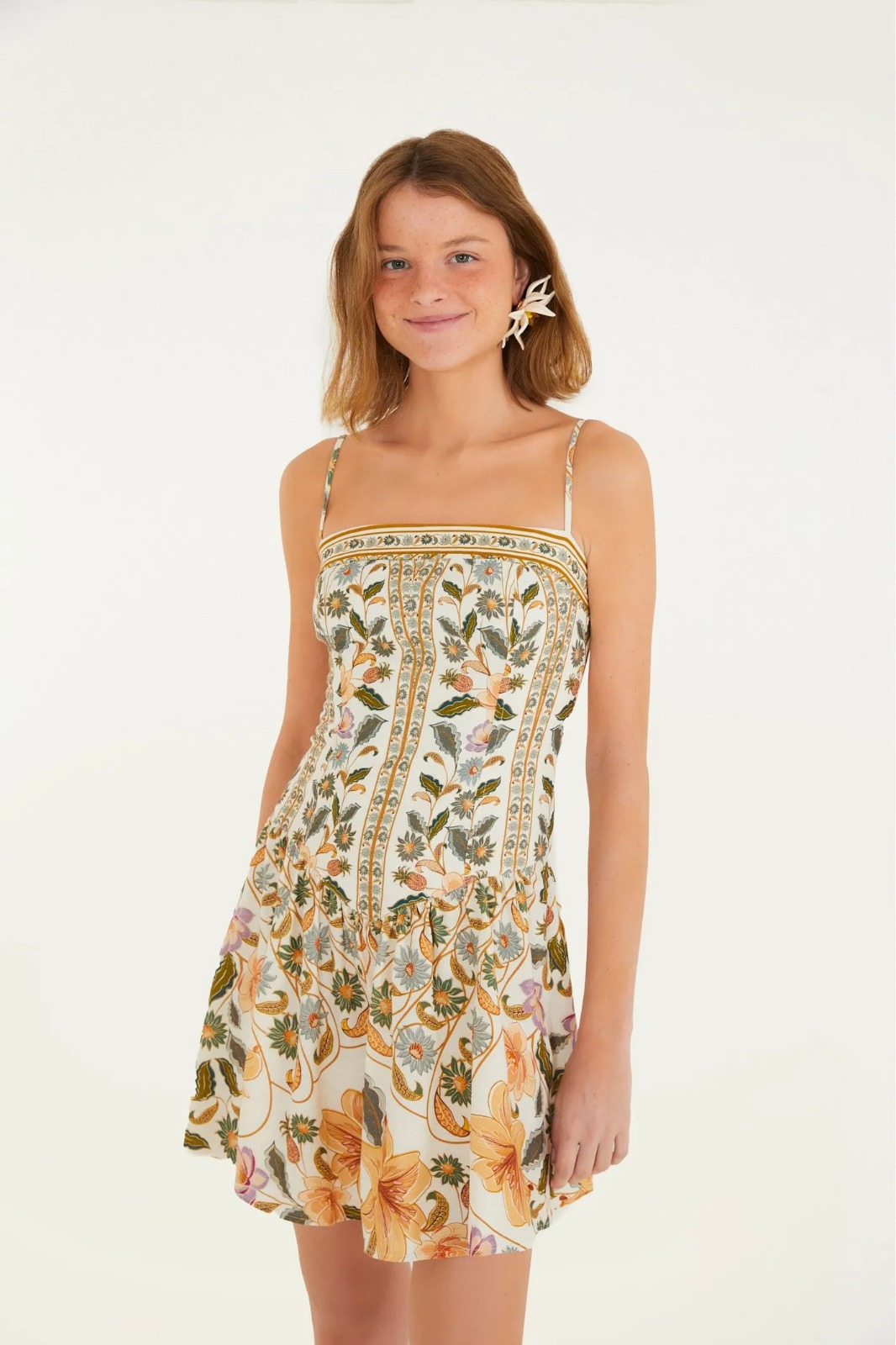 vestido curto estampado marcelle. com alças finas e decote reto que realçam a leveza da peça. a modelagem solta e fluida garante conforto, enquanto o babado delicado na barra oferece charme em cada movimento. perfeito para um passeio ao ar livre ou um encontro casual. FARM RIO original - verão 26.