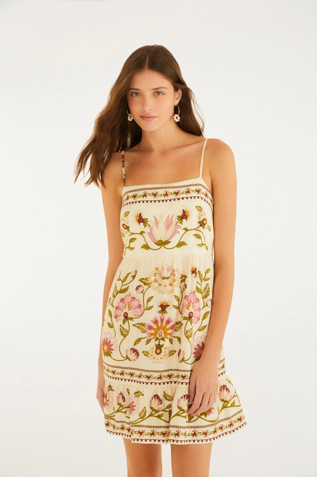 vestido curto natureza romantica. com alças finas e decote reto, seu design é realçado por detalhes delicados, proporcionando um charme casual e autêntico. ideal para encontros ao ar livre ou passeios de fim de semana, essa peça combina conforto e estilo de forma harmoniosa.