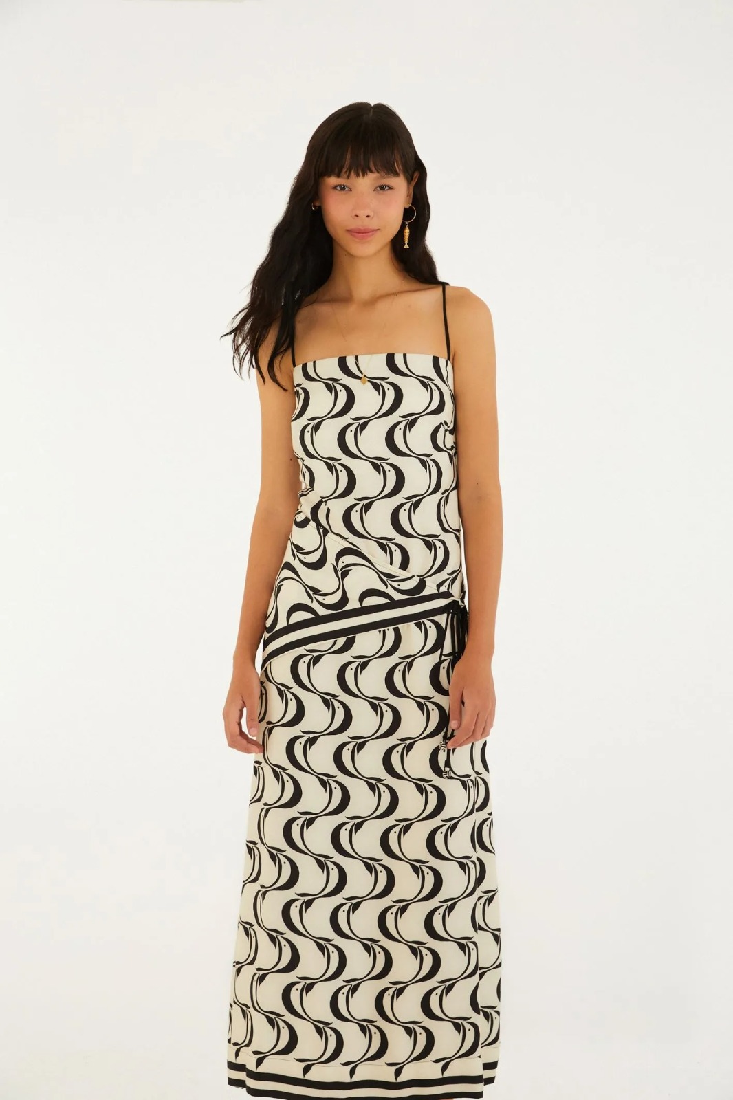 vestido lenço estampado copa peixe. com seu corte reto e alças finas, este vestido é um convite para um look casual e sofisticado. seu caimento leve oferece conforto e versatilidade, ideal para dias ensolarados e noites descontraídas. perfeito para combinar com acessórios marcantes. FARM RIO original - verão 26.