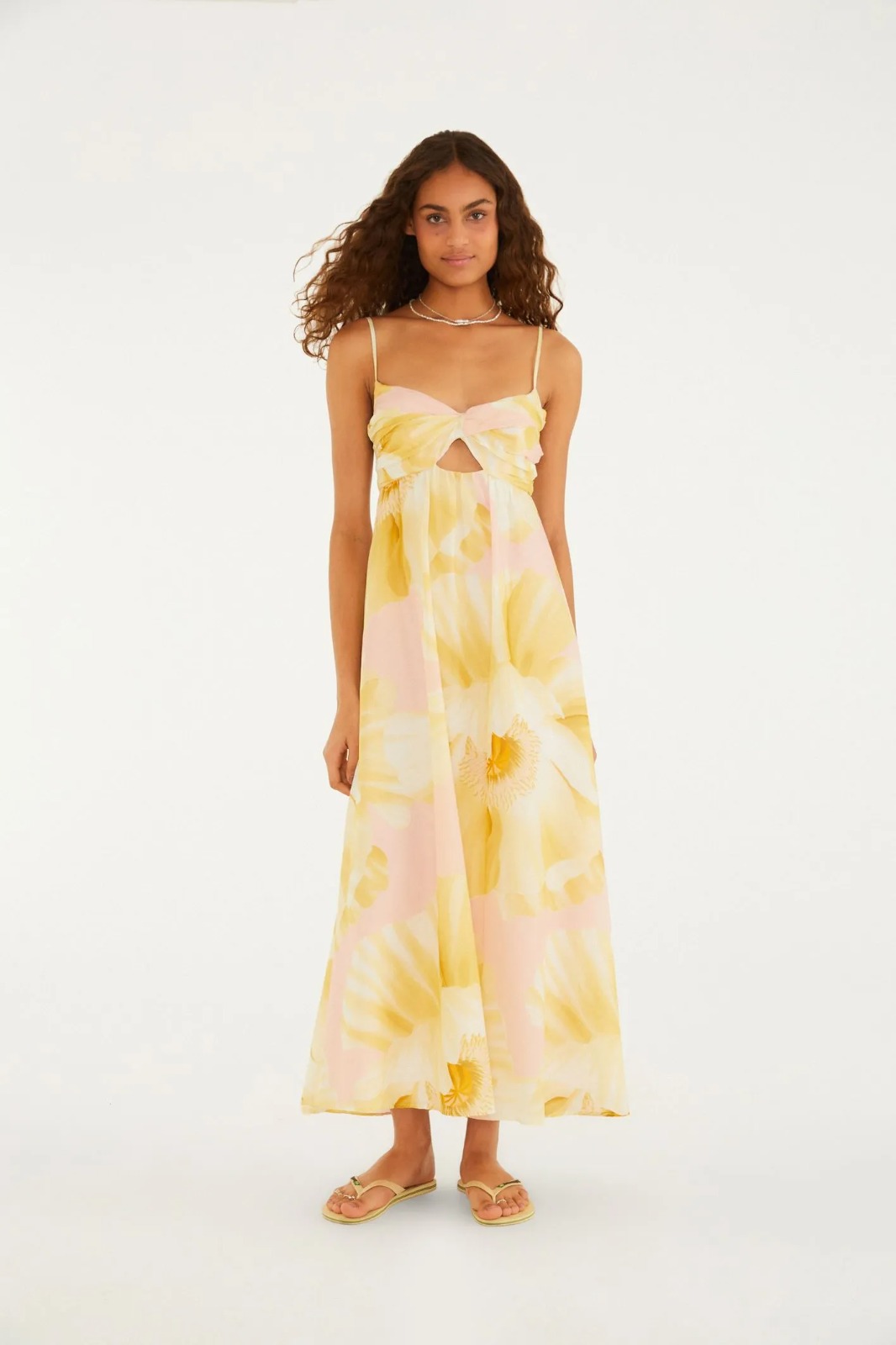 vestido longo alça festa de papoula. alças finas e delicadas abraçam os ombros, complementadas por um corte único no busto, trazendo um toque especial e moderno. a modelagem fluida proporciona liberdade aos movimentos, perfeita para eventos ao ar livre ou celebrações em ambientes descontraídos.