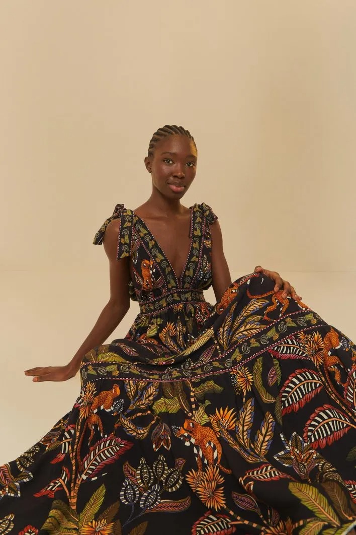 vestido longo estampado festa de caju é a escolha perfeita. com decote v profundo, ele apresenta alças largas ajustáveis com amarração, proporcionando conforto e um toque especial. sem mangas, permite liberdade de movimento. sua modelagem é solta e fluida, complementada por um elástico delicado na cintura, que proporciona um ajuste perfeito. esta é uma peça exclusiva da coleção original FARM RIO - verão 25
