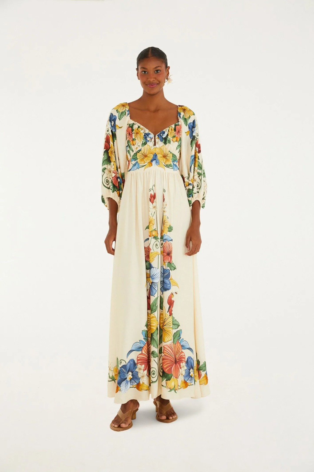 vestido longo manga estampado tropicalzinho lenço. traz um decote quadrado que destaca a parte superior e mangas amplas que remetem à leveza. a cintura é marcada por um elástico, garantindo conforto e caimento suave. ideal para eventos casuais ou um passeio charmoso em dias quentes. FARM RIO original - verão 26.