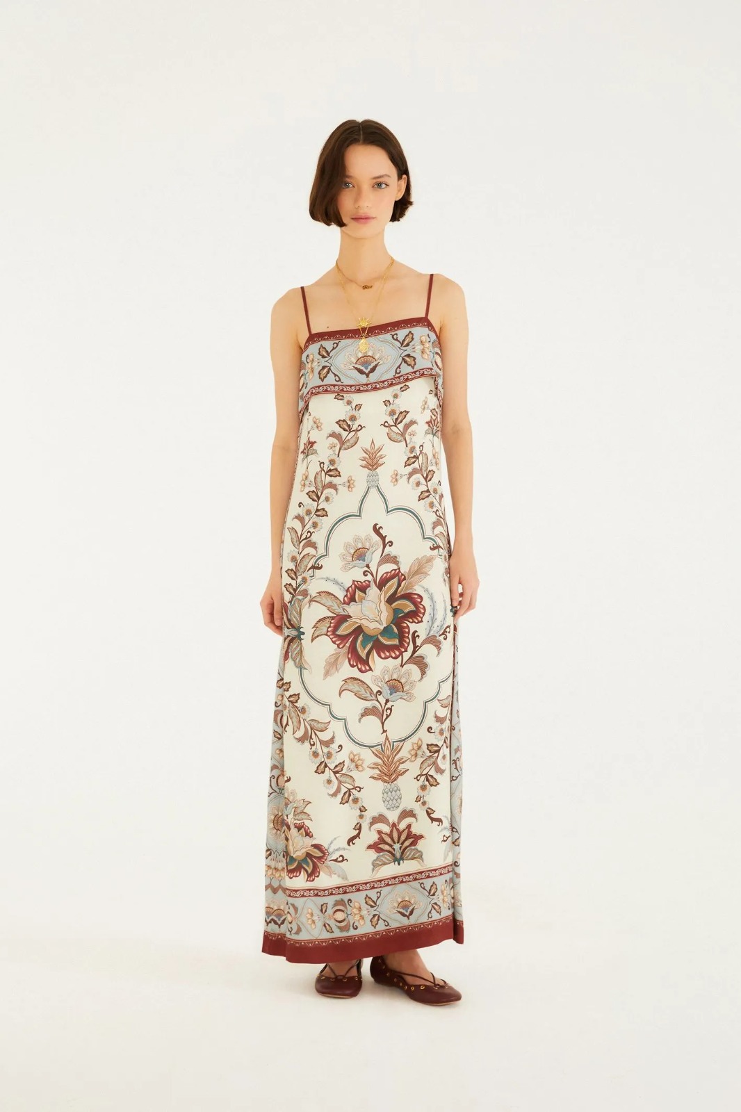 vestido longo pala estampado jardim majestoso. feito em tecido leve e fluido, possui alças finas e decote reto que realçam a delicadeza da peça. o caimento solto permite conforto e movimento. ideal para festas ao ar livre ou jantares especiais, trazendo frescor e um toque natural ao visual.