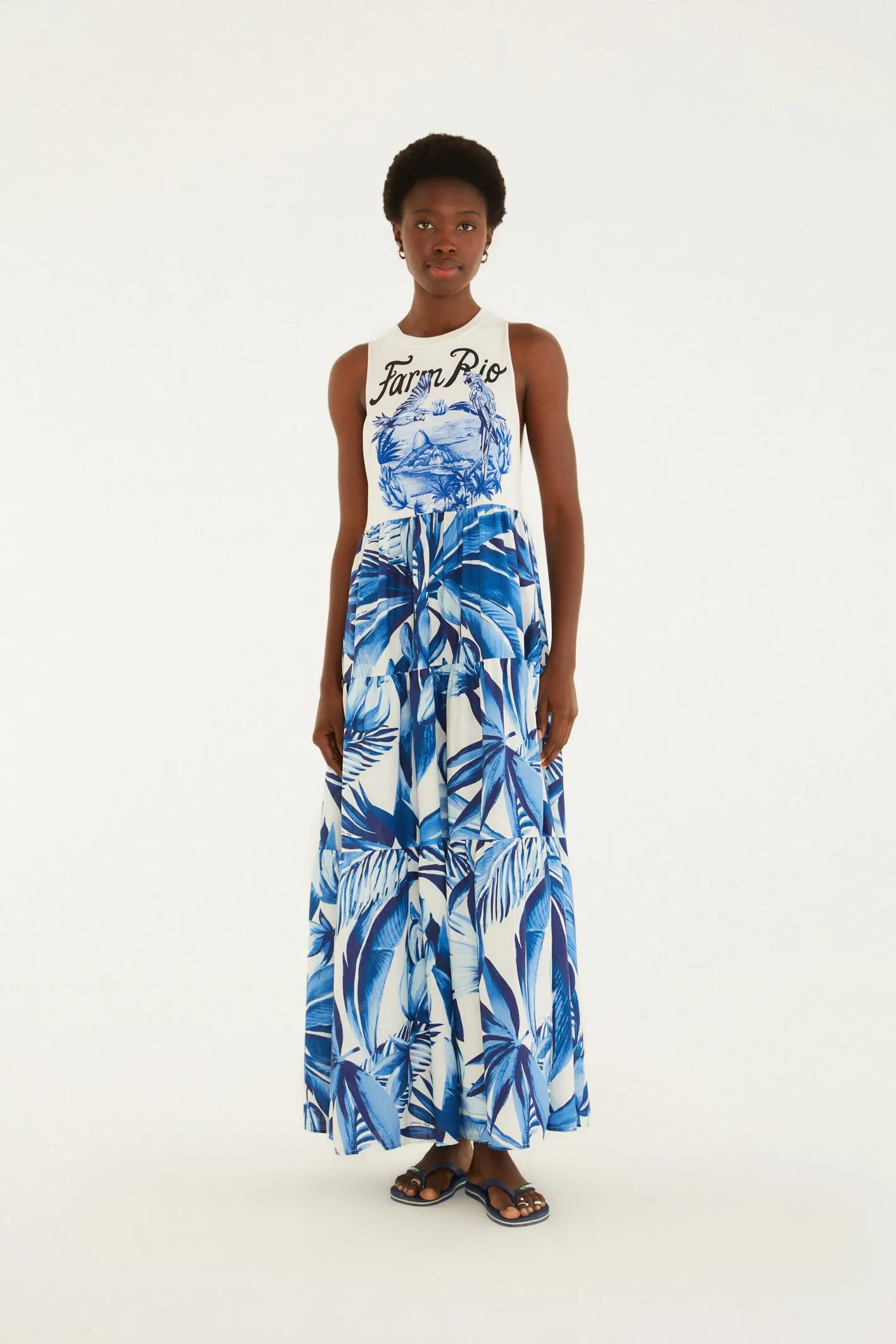 vestido midi portal araras. decote arredondado e alças largas que proporcionam conforto. a parte inferior esbanja movimento com uma fluidez envolvente, perfeita para dias de verão e encontros casuais. tecido leve e corte que favorecem o bem-estar, trazendo leveza ao dia a dia.