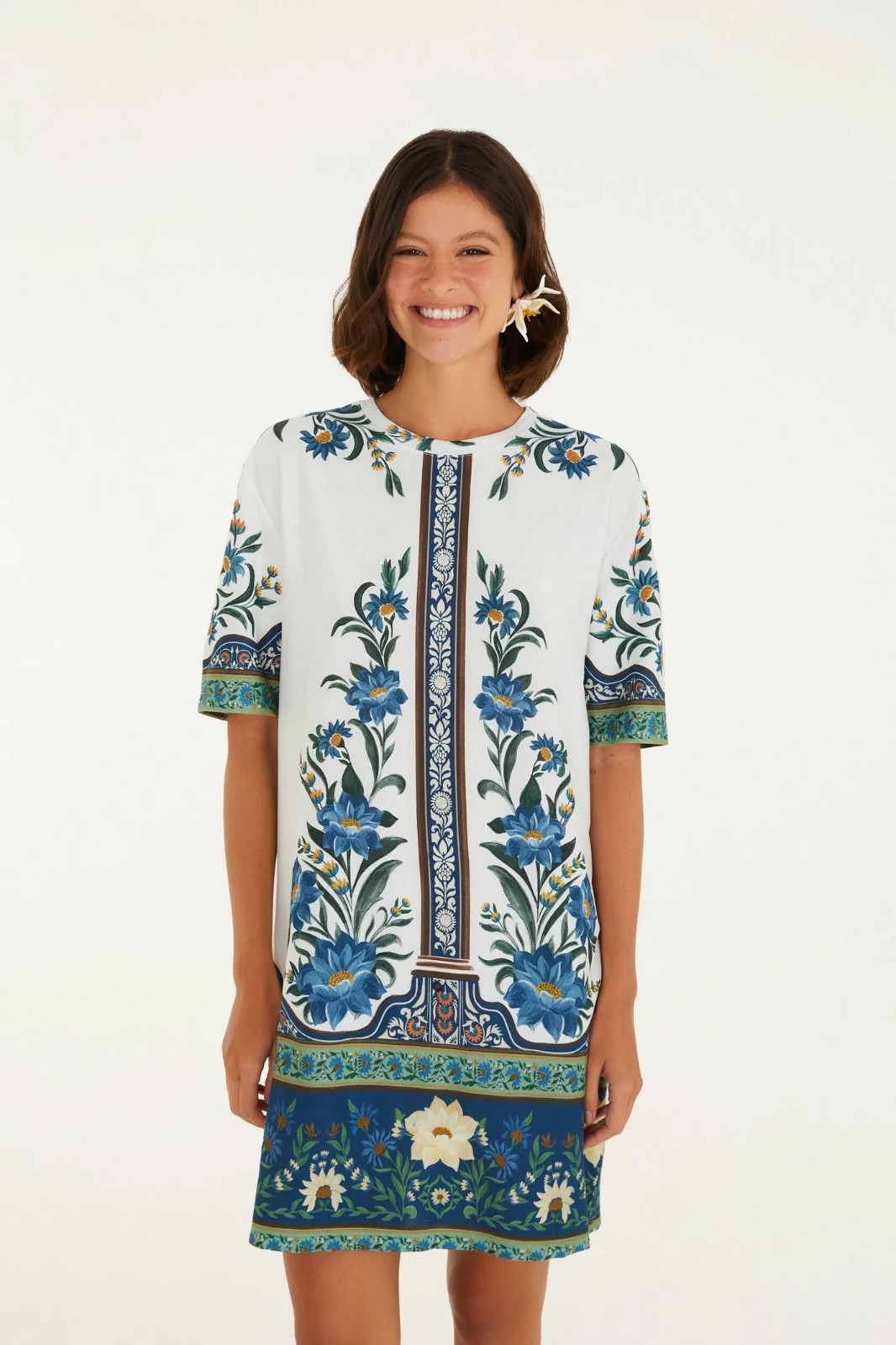 vestido t-shirt básico estampado manoela. com corte reto e leve, possui decote redondo delicado e mangas curtas que garantem conforto. a estampa única traz charme à peça casual e versátil, perfeita para um passeio no parque ou um almoço especial. FARM RIO original - verão 26.