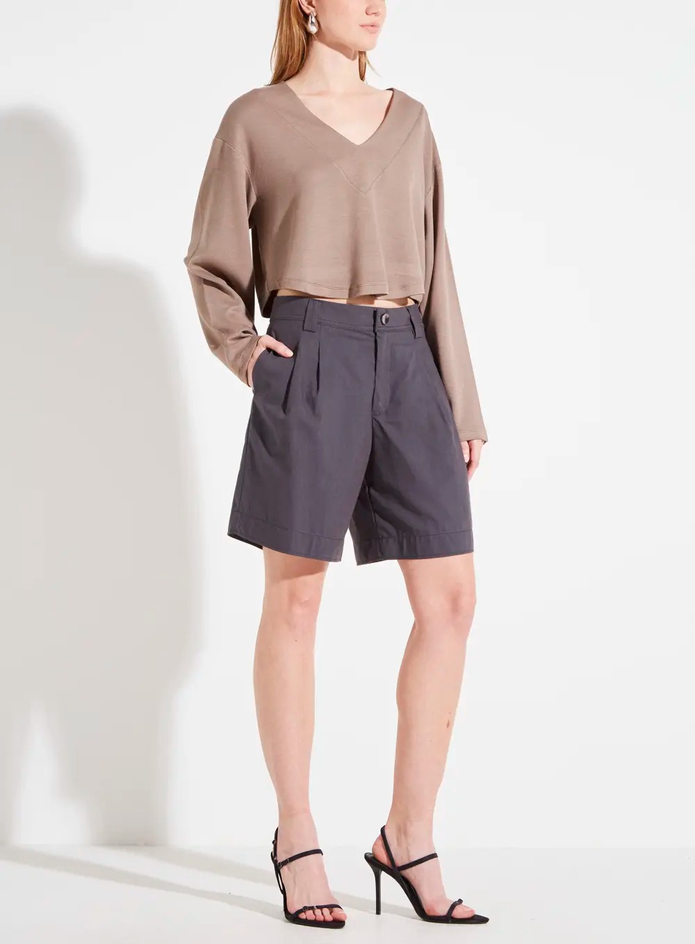 Bermuda: Modelagem reta, cintura alta, bolsos frontais e traseiros, fechamento por botão e zíper, pences frontais.