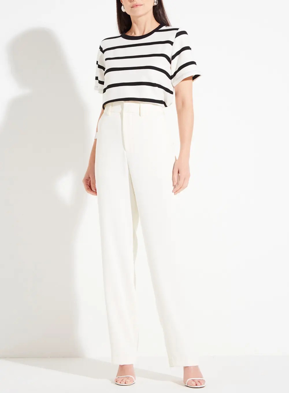 Camiseta: Modelagem comfort, gola careca, mangas curtas, estampa listrada em preto e branco e acabamento em poliéster macio.