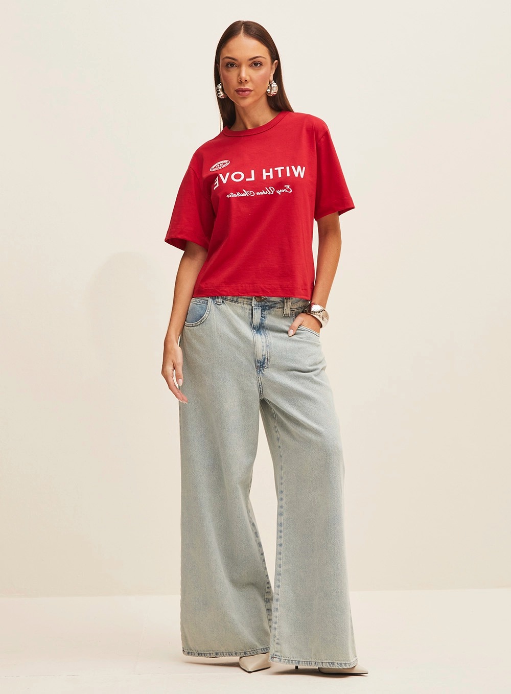 Camiseta: Peça com modelagem cropped e caimento soltinho, proporcionando um visual descontraído e moderno. Possui gola redonda clássica e mangas curtas.