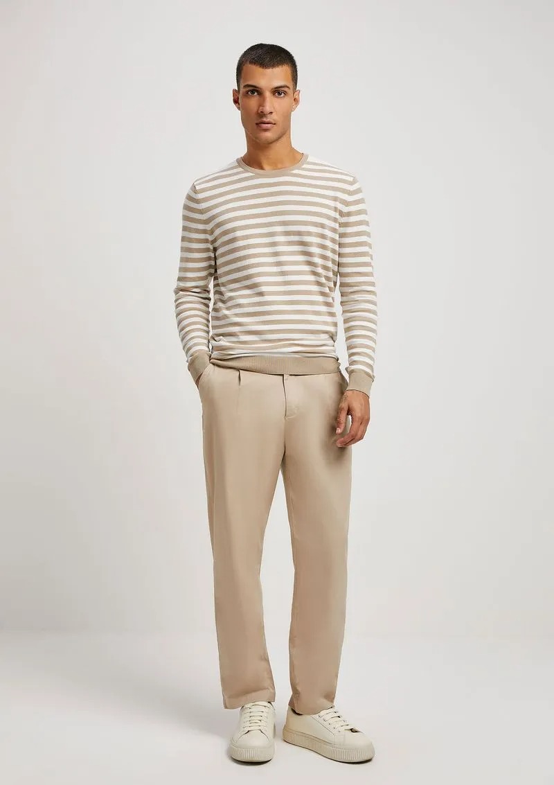 Calça masculina chino em sarja, a escolha ideal para seu look casual. Esta peça tem o estilo de alfaiataria mas é feita em sarja de algodão e elastano, seu diferencial é o toque empapelado, caimento leve e recorte despojado.