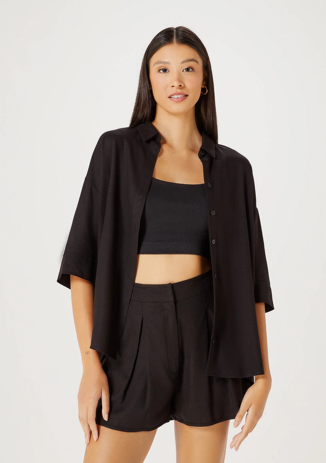 Camisa feminina manga curta em linho, a aliada para compor looks incríveis. A peça tem silhueta ampla, gola tradicional, vista com botões e parte traseira mais alongada.