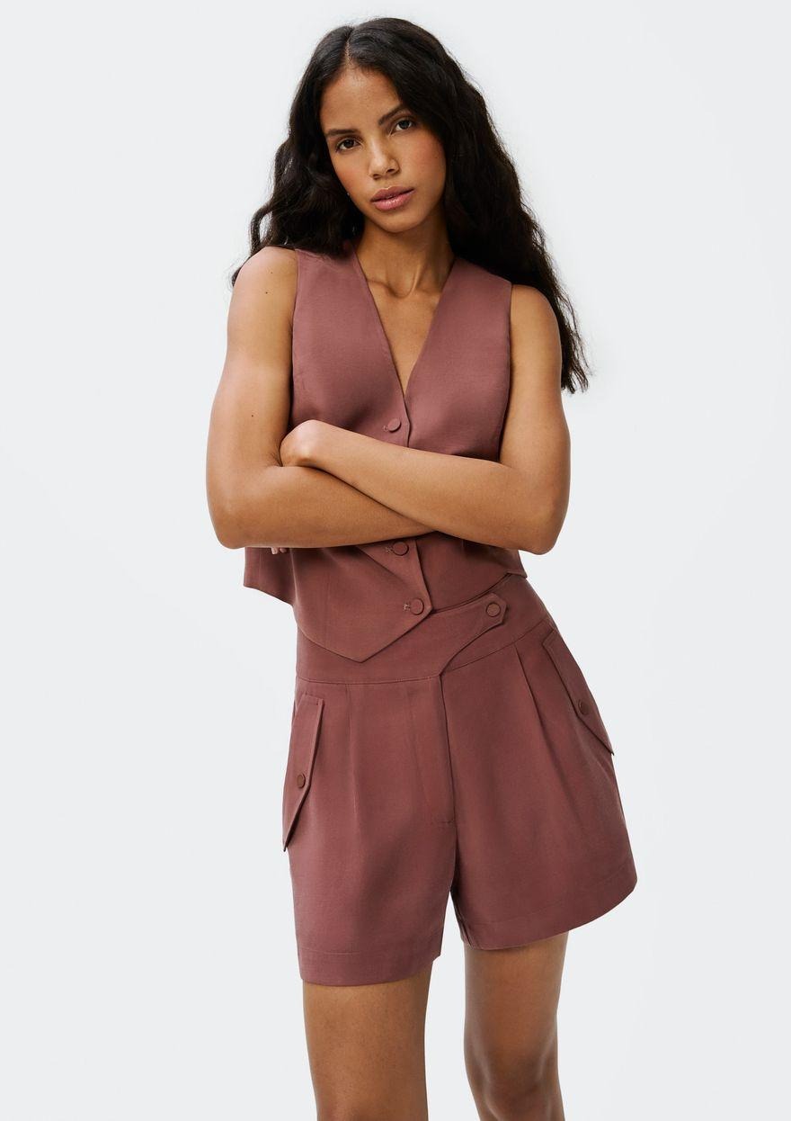 Shorts feminino em tecido peachtouch, com toque macio. Possui detalhes de leves pregas frontais, bolsos com lapela e botão, além de bolsos aplicados na parte posterior. Fecho por tira no cós com botão.