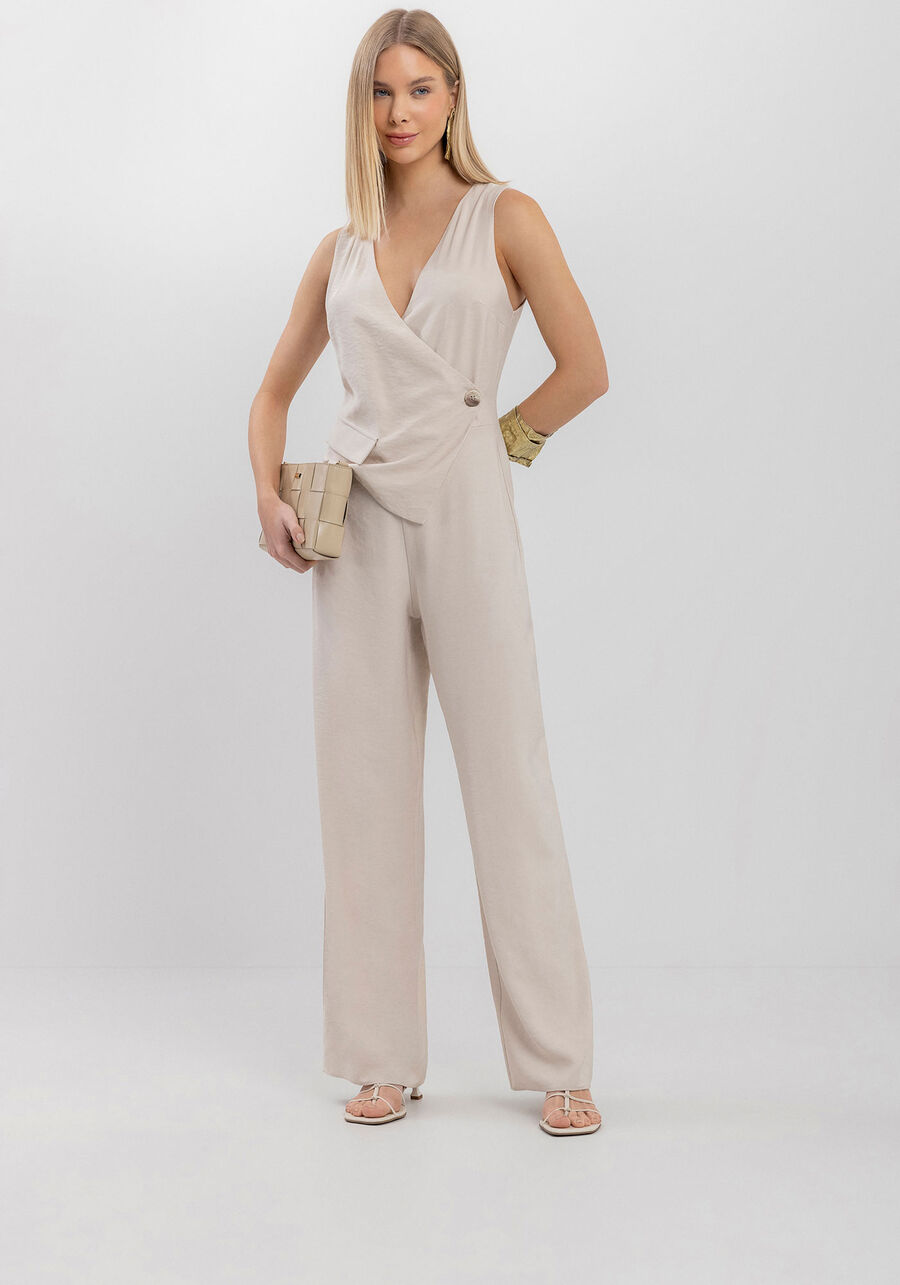 Este macacão longo em alfaiataria se destaca pelos detalhes elegantes, como a modelagem transpassada e a lapela frontal. Com acabamento e caimento impecáveis, é a escolha certa para elevar suas produções.