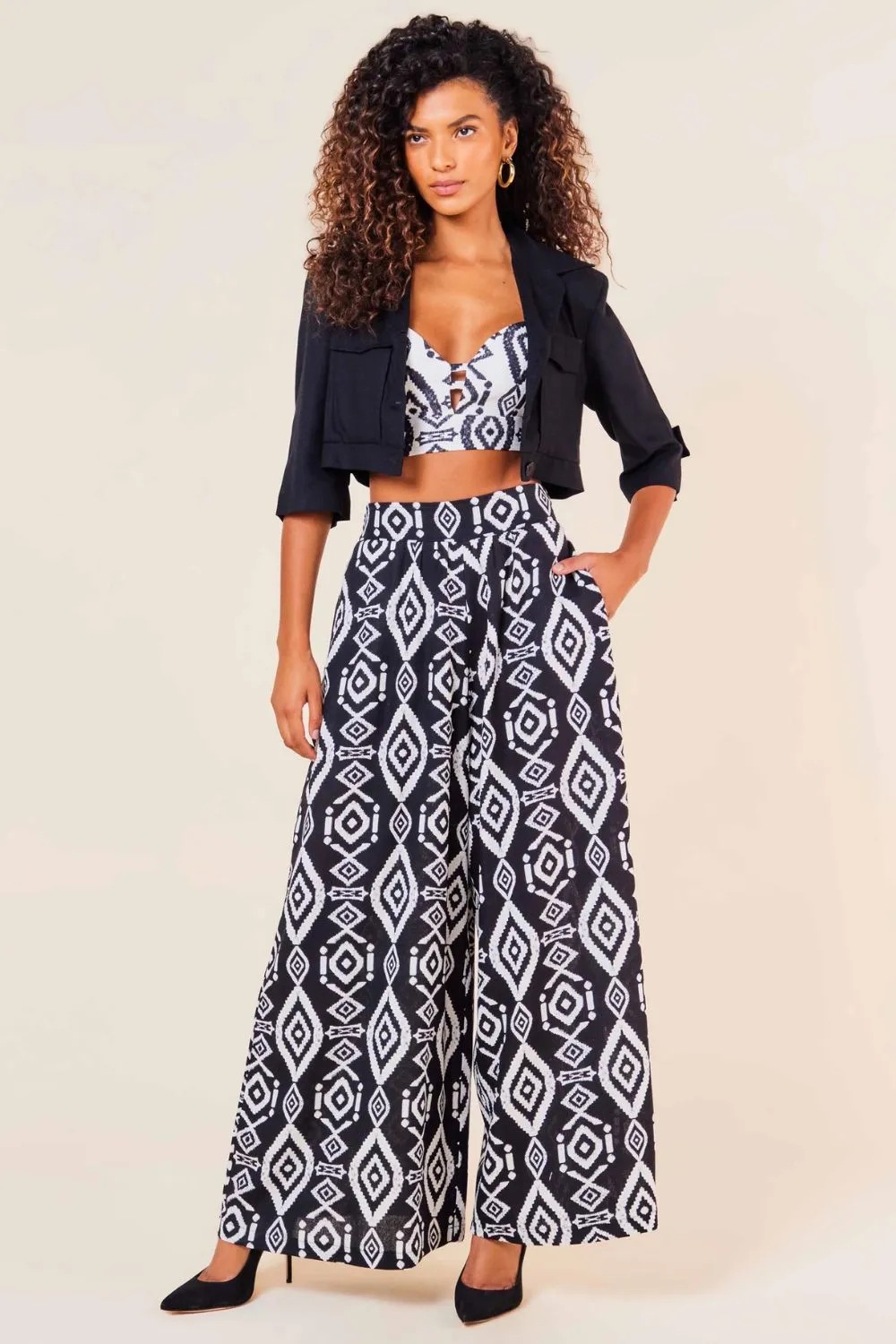A Calça, confeccionada em linho, possui modelagem pantalona, com bolsos laterais e barra ampla. Uma peça elegante e moderna, ideal para ser combinada com croppeds mais justos.
