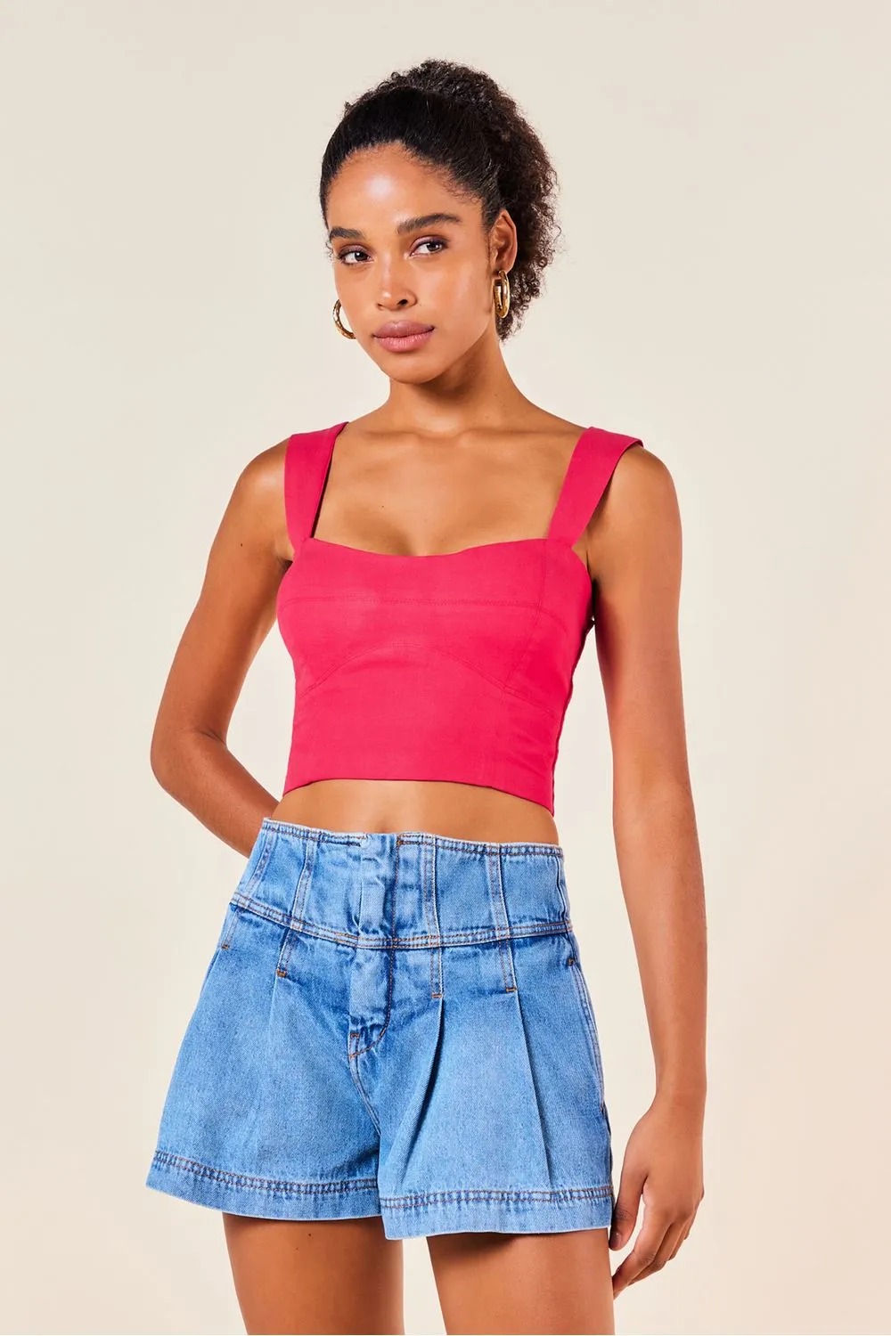 O Cropped, confeccionado em linho, possui decote levemente arredondado, alças largas, lastex nas costas e recortes frontais. Uma peça que combina com tudo: calças, shorts e saias da coleção.