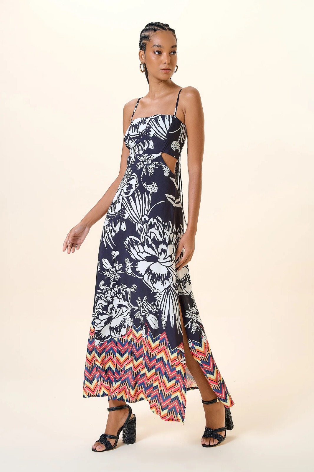 O Vestido longo estampado possui decote reto, alças finas reguláveis, recorte vazado lateral e lastex nas costas. Sua saia conta com recorte e fenda lateral, trazendo fluídez e feminilidade ao vestido. Uma aposta certeira para a estação.
