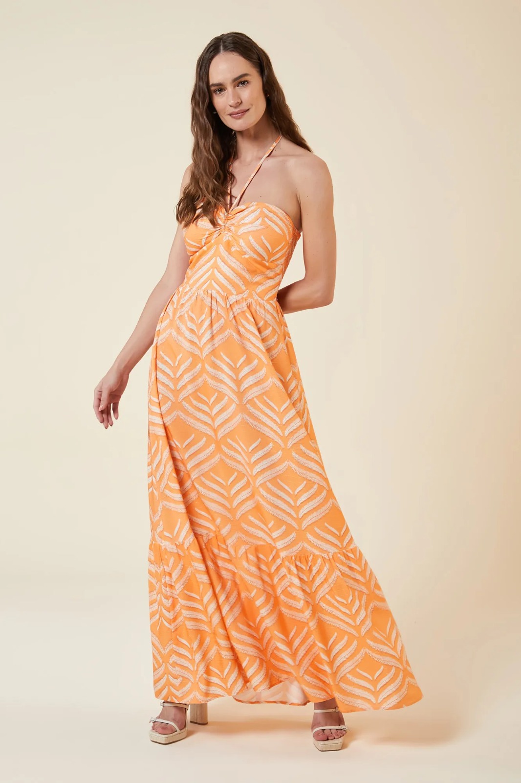 O Vestido longo e estampado possui decote em coração com franzimento no busto, amarração no pescoço, lastex traseiro e recorte na saia, trazendo fluidez para o vestido. Use nos dias quentes da estação e crie um look fashionista.