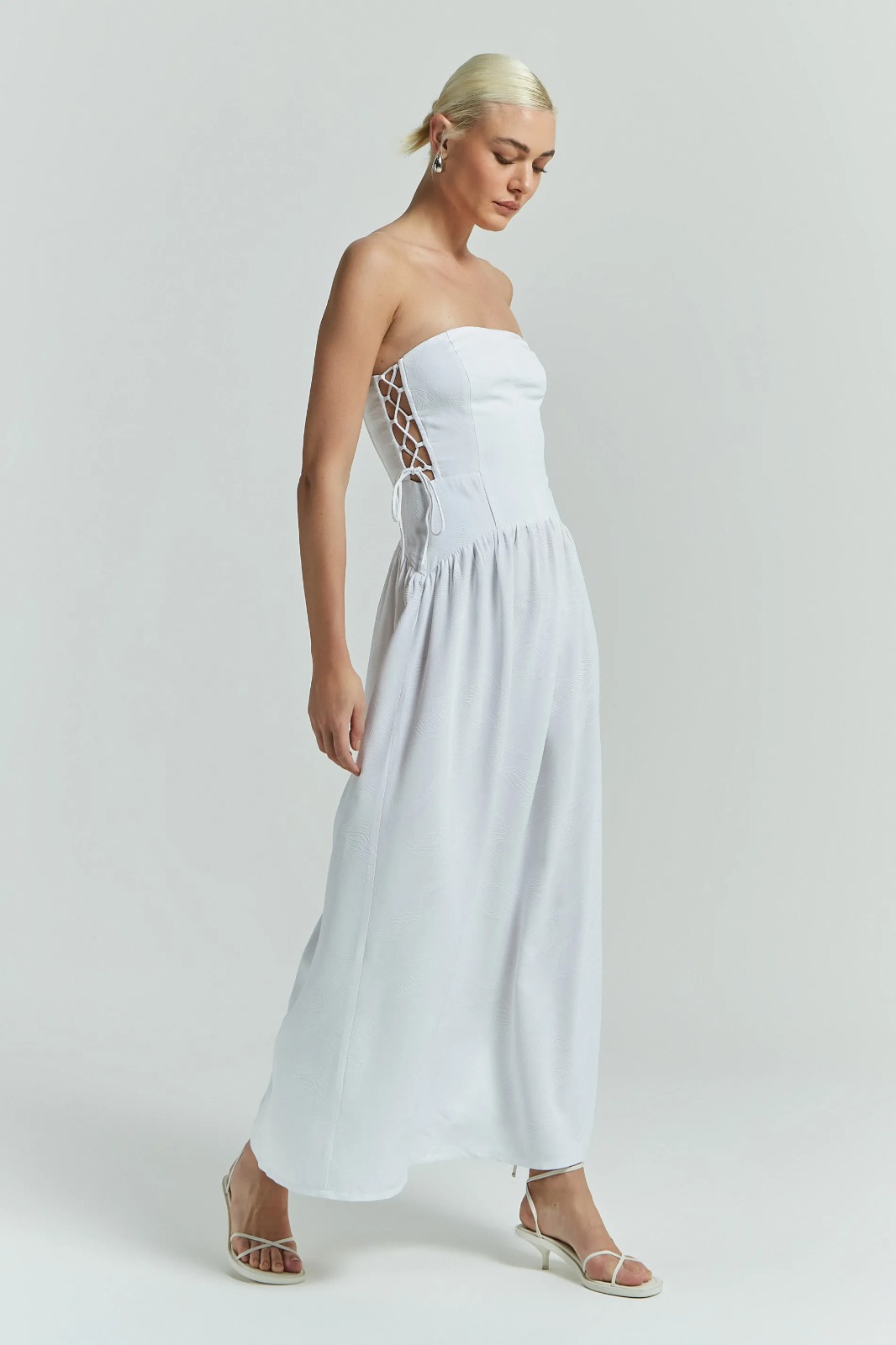 O Vestido longo conta com decote reto de modelo tomara que caia, amarração trançada na lateral, recortes no busto e zíper traseiro para fechamento. Uma peça que traz personalidade ao seu look e é perfeita para a estação.