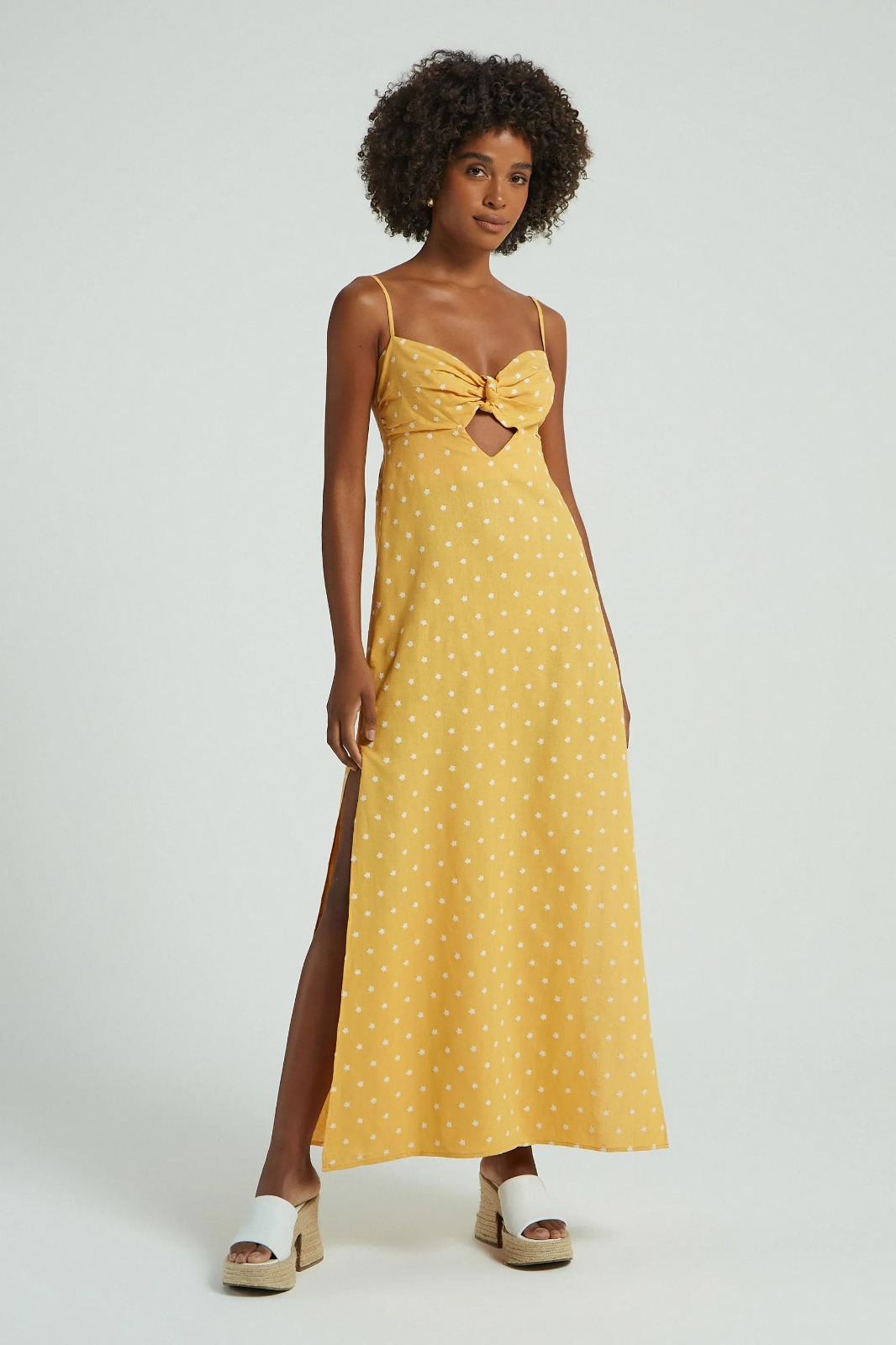 O Vestido longo estampado possui decote em coração com nó no busto, recorte vazado frontal, alças finas reguláveis, lastex traseiro e fendas laterais na saia. Um modelo fresco e moderno, que traz a moda print para a estação!