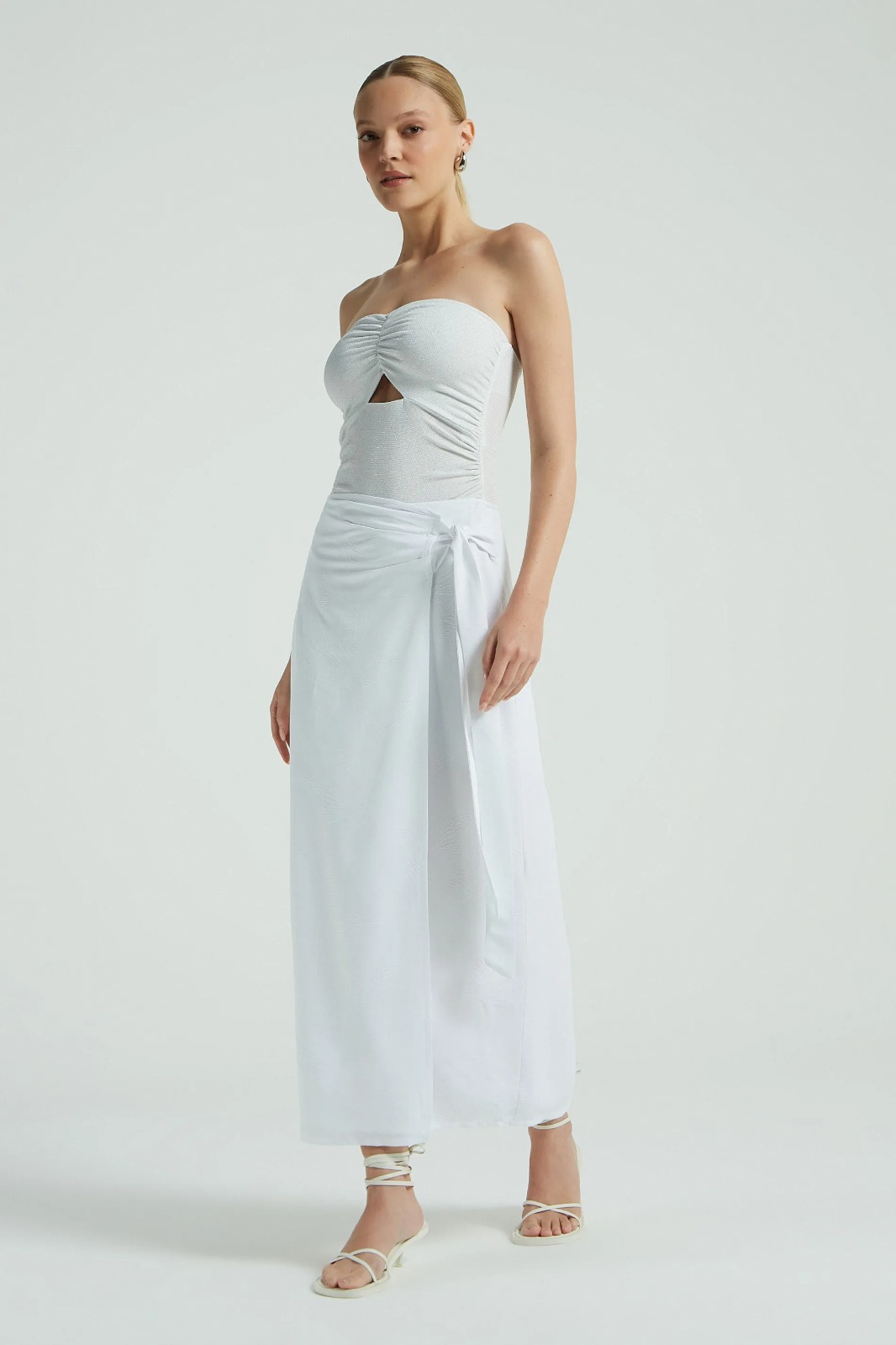 A Saia, de modelo envelope, conta com transpasse e amarração lateral. Uma peça elegante que combina com croppeds e blusas da coleção.