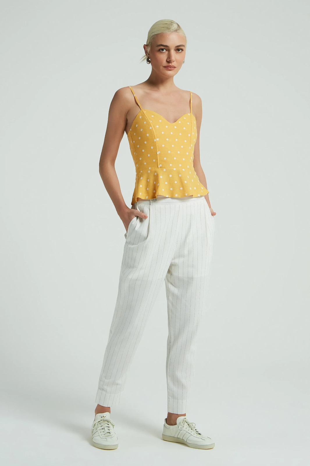 A Calça, confeccionada em tecido de risca de giz, possui detalhes frontais com botões, bolsos laterais e pregas frontais. Uma peça elegante e atemporal, que pode ser combinada com croppeds e blazer para um office look incrível.
