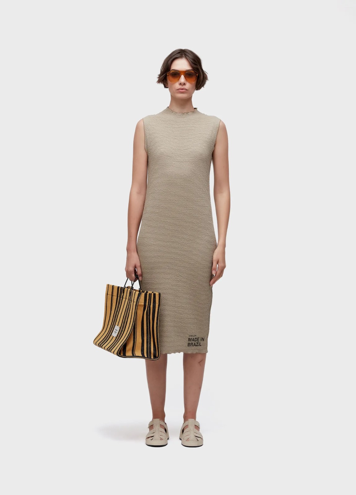 VESTIDO MIDI DOUBLE FACE FEITO EM MALHA DE ANARRUGA; MODELAGEM AJUSTADA AO CORPO; ACABAMENTOS FEITOS EM MINI OVERLOCK.