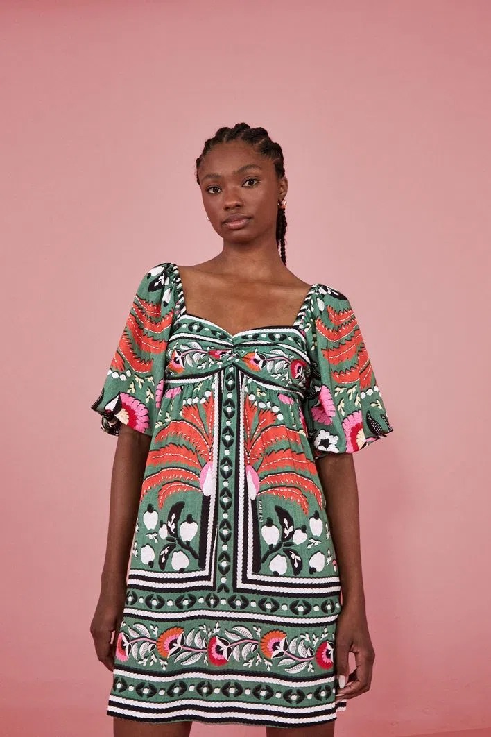 Vestido curto estampado paraíso dos coqueiros. possui decote v com drapeado no meio do busto e mangas curtas fofas com elástico fino drapeando os ombros e pala de elástico nas pontas. vem com pala de lastex no meio das costas e possui modelagem soltinha de viscose. esta é uma peça original da coleção farm do brasil: orgulho de estampar o mundo.