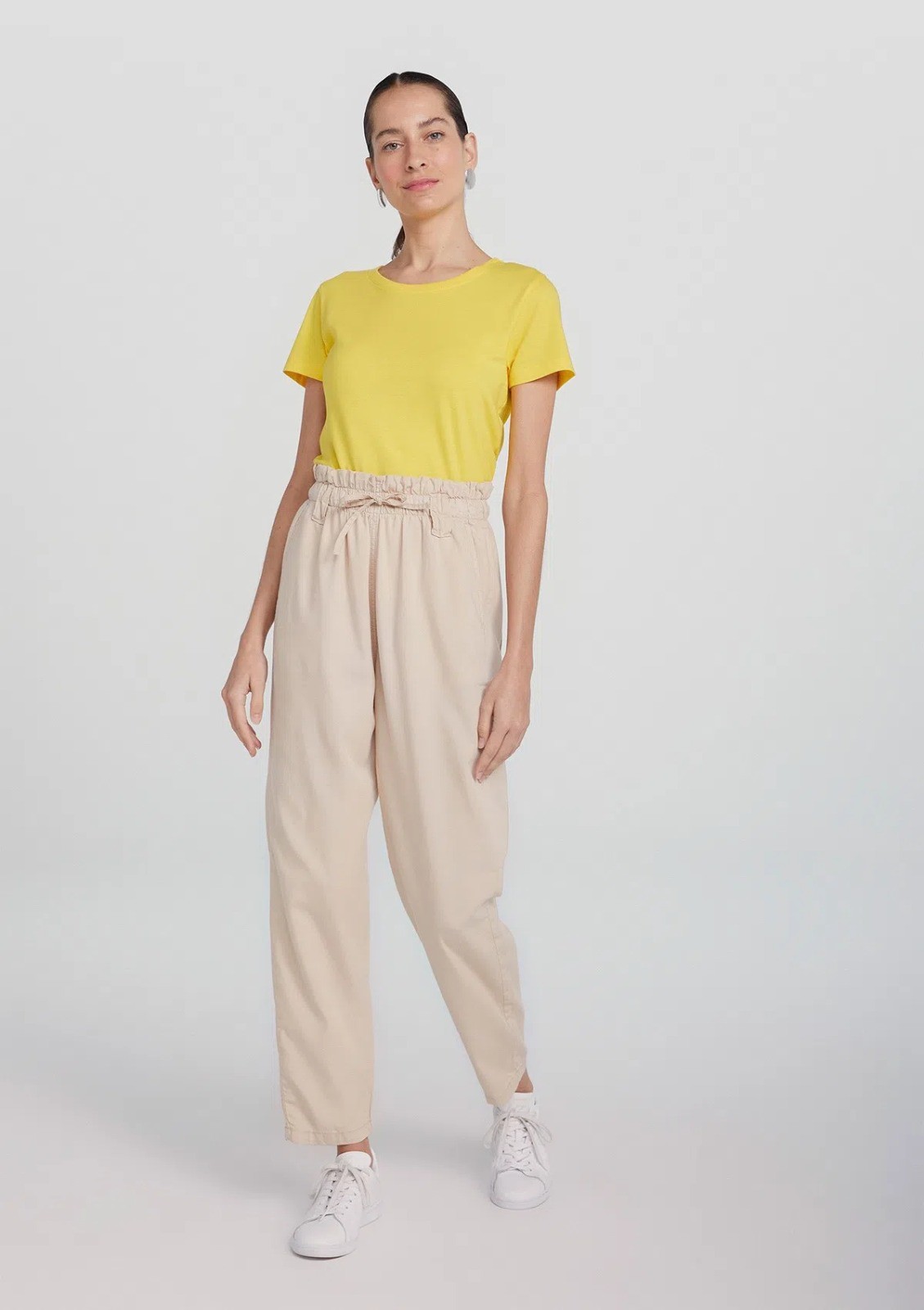 Calça Feminina Cintura Alta Clochard. Desenvolvida em liocel, tecido que assemelha a sarja estruturado com toque macio e que não amassa com facilidade. Com modelagem reta solta ao corpo, cintura alta clochard e cós com cordel para ajuste com efeito drapeado. Possui passantes por cima do cadarço possibilitando o uso de cintos, bolsos funcionais na parte lateral e nas costas. Leve e confortável essa calça é ideal para as estações mais quentes.