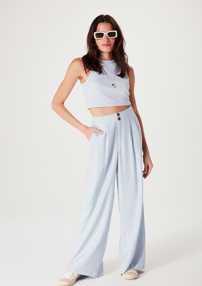 Calça Feminina Pantalona. Calça pantalona em tecido plano de viscose e poliéster. Conta com cintura super alta cós com fechamento de zíper e botões. Além de pregas frontais, bolso faca funcional e barra larga.;