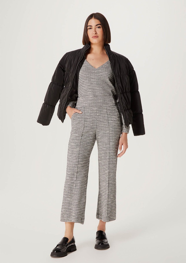 Calça Feminina confeccionada em malha texturizada de algodão e poliéster. Conta com modelagem reta, cintura alta, cós com pala larga e elástico nas costas, bolso faca nas laterais, friso no centro das pernas.;